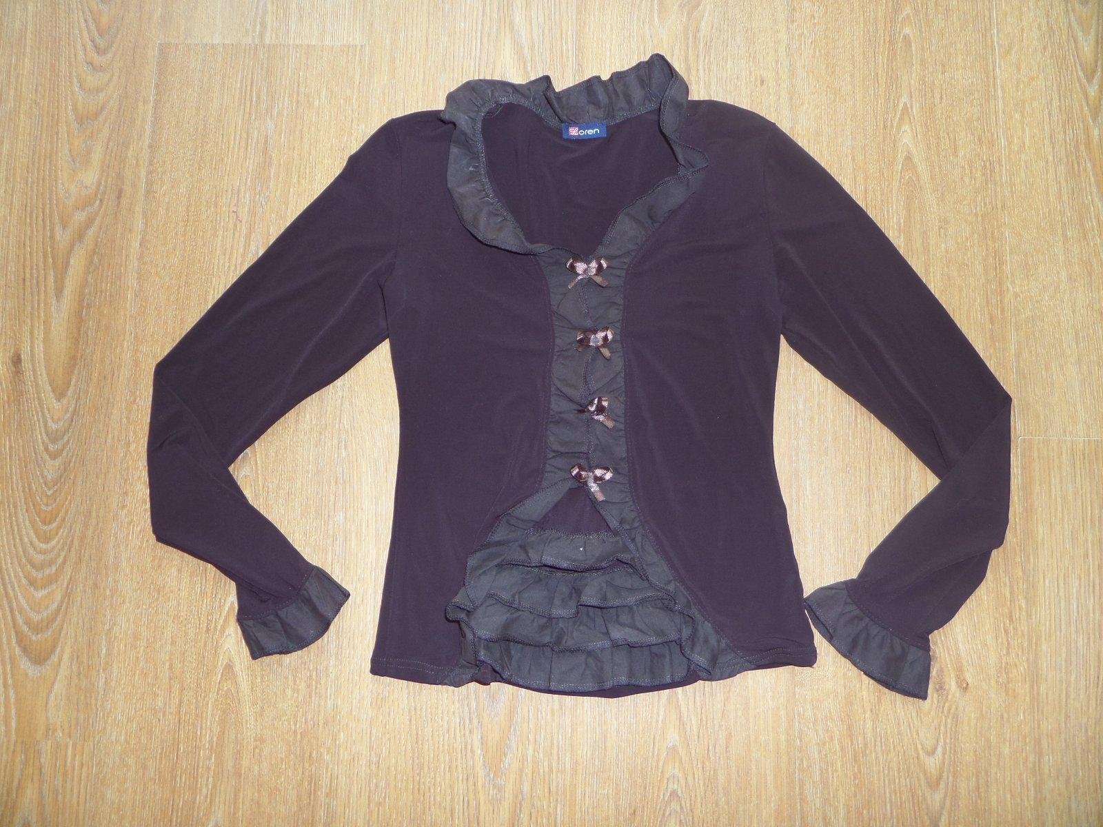 Postavu tvarujúca blúzka, v čokoládovej farbe, pekne v detailoch zdobená. TOP stav ! Rozmery: šírka pod pazuchami = 49 cm x 2, dĺ = 66 cm, rukáv = 66 cm. 100 % bavlna.
