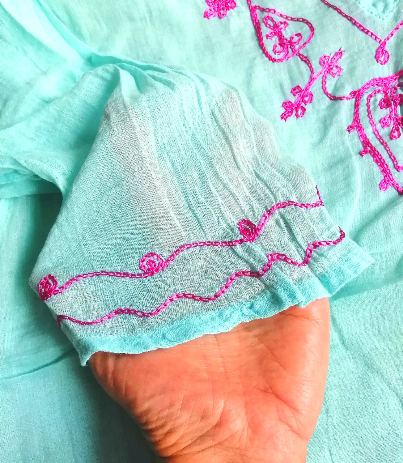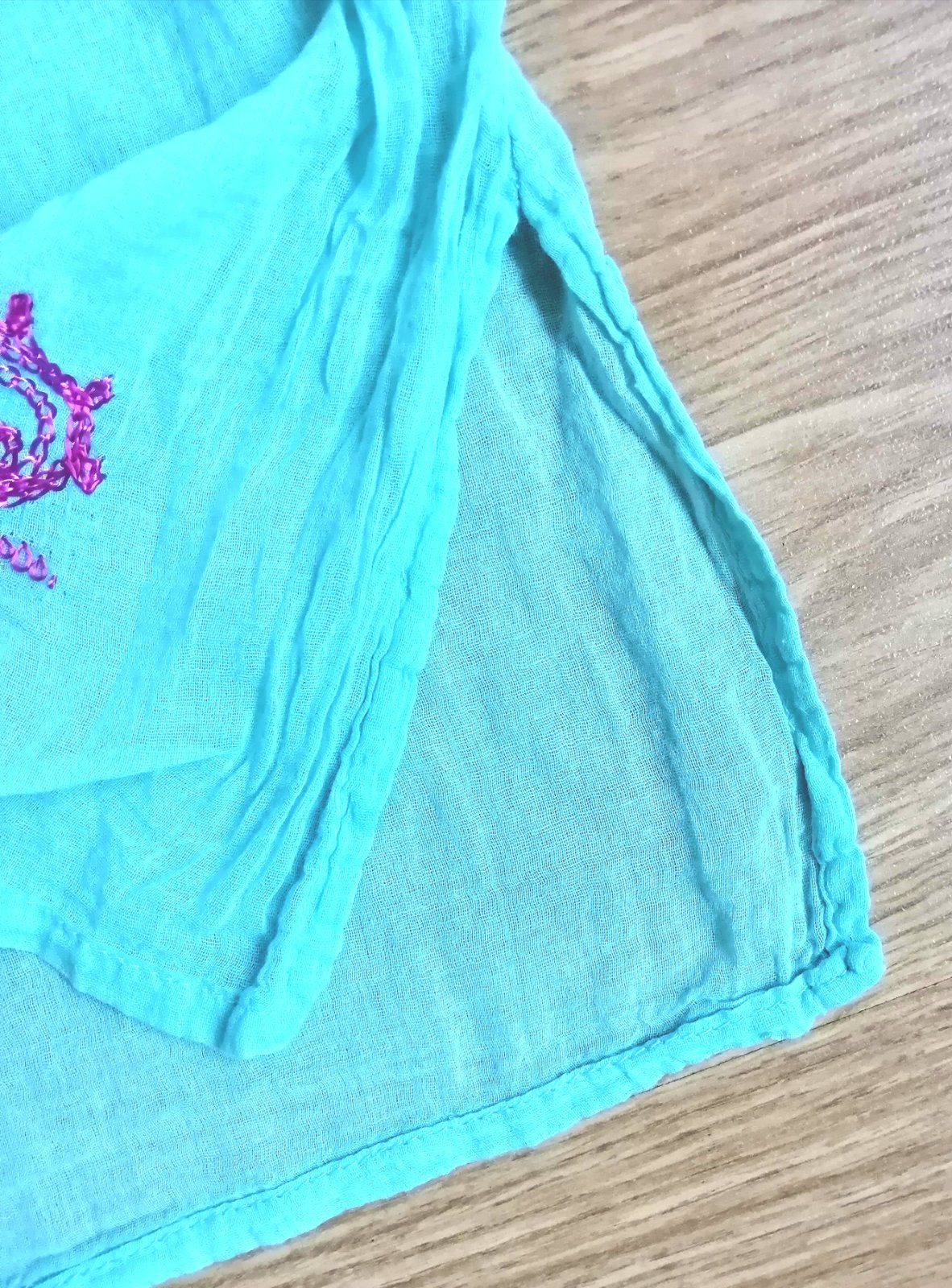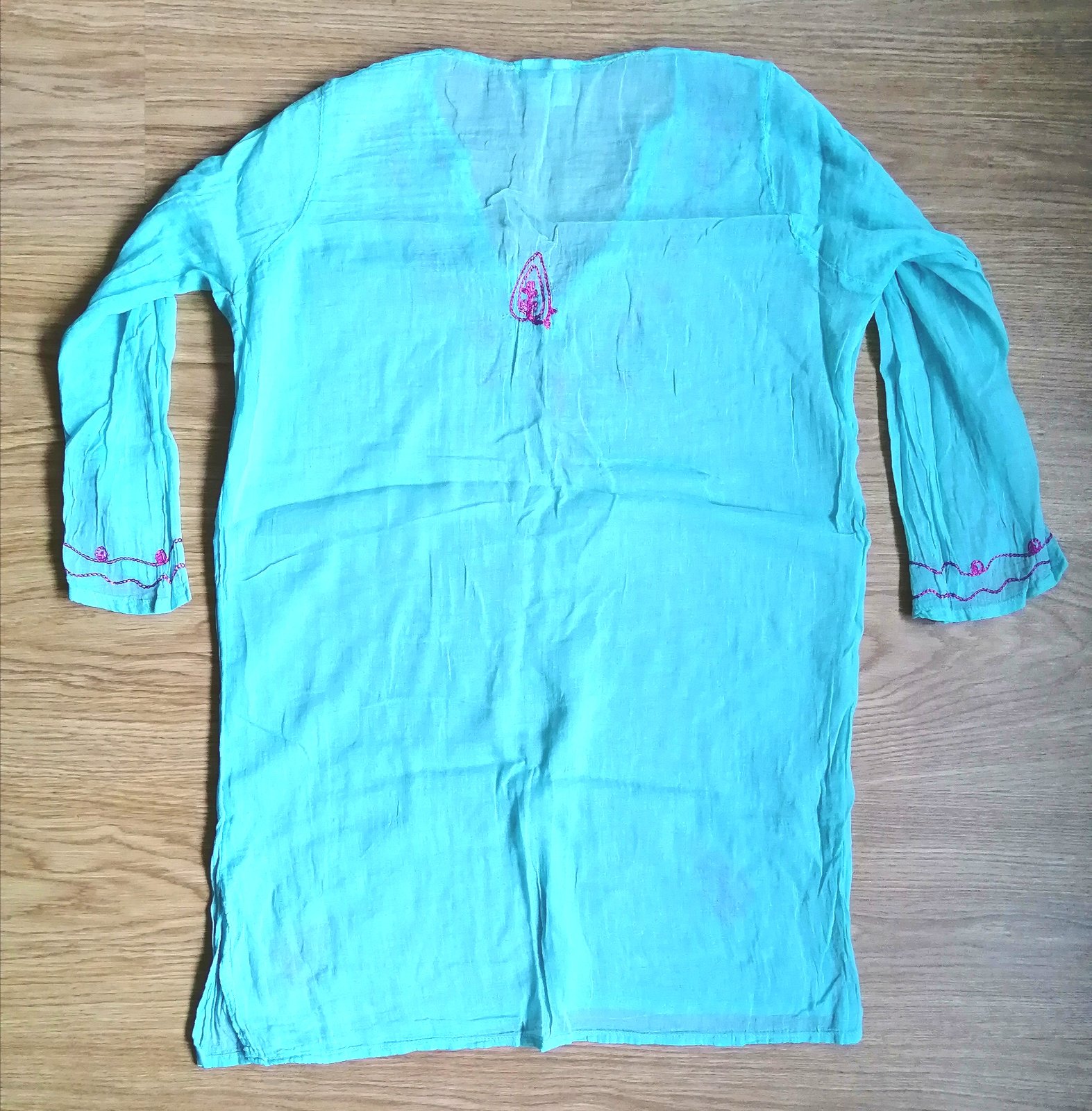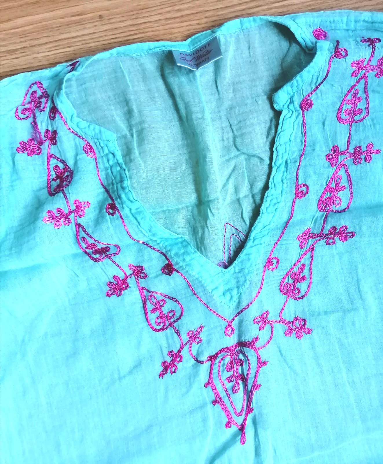 Dámska ľahká plážová tunika zn. Davidoff Woman, v tyrkysovej farbe s ružovými vyšívanými detailami, trištvrťové rukávy, dolu rázporky. Veľ. univerzálna.