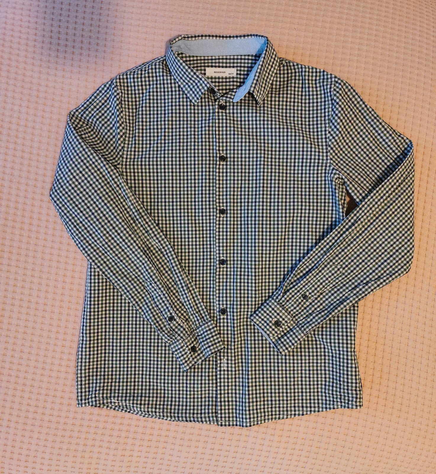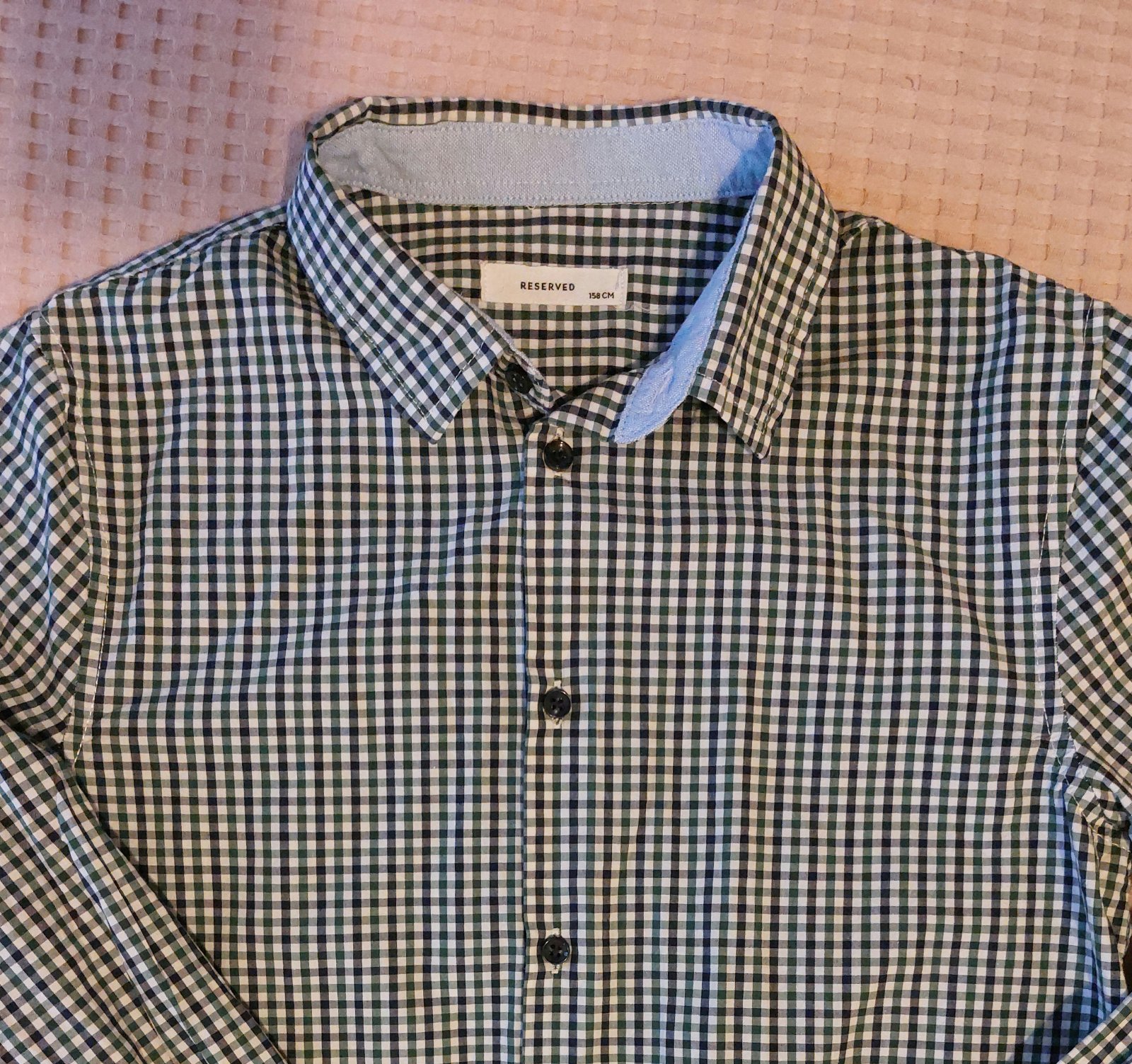 Ponúkam krásnu košeľu z jemnej a na dotyk príjemnej látky značky Reserved, veľkosť 158. Vzor je modro-zelená mriežka na bielom podklade. Košeľa je ideálna na nosenie do školy, ale aj na špeciálnu príležitosť. Bola oblečená len raz na vysvedčenie,takže je v dokonalom stave. :)