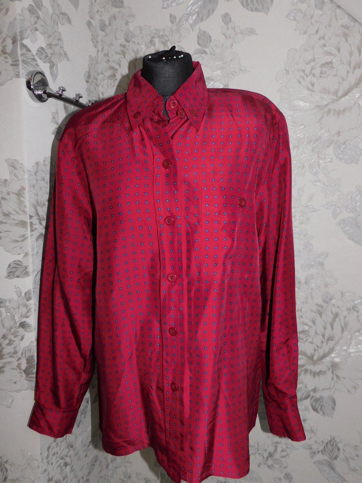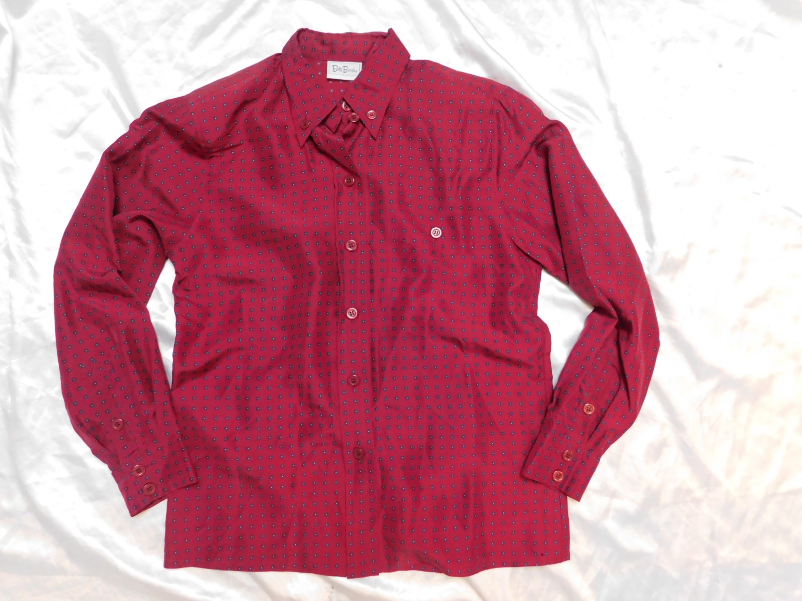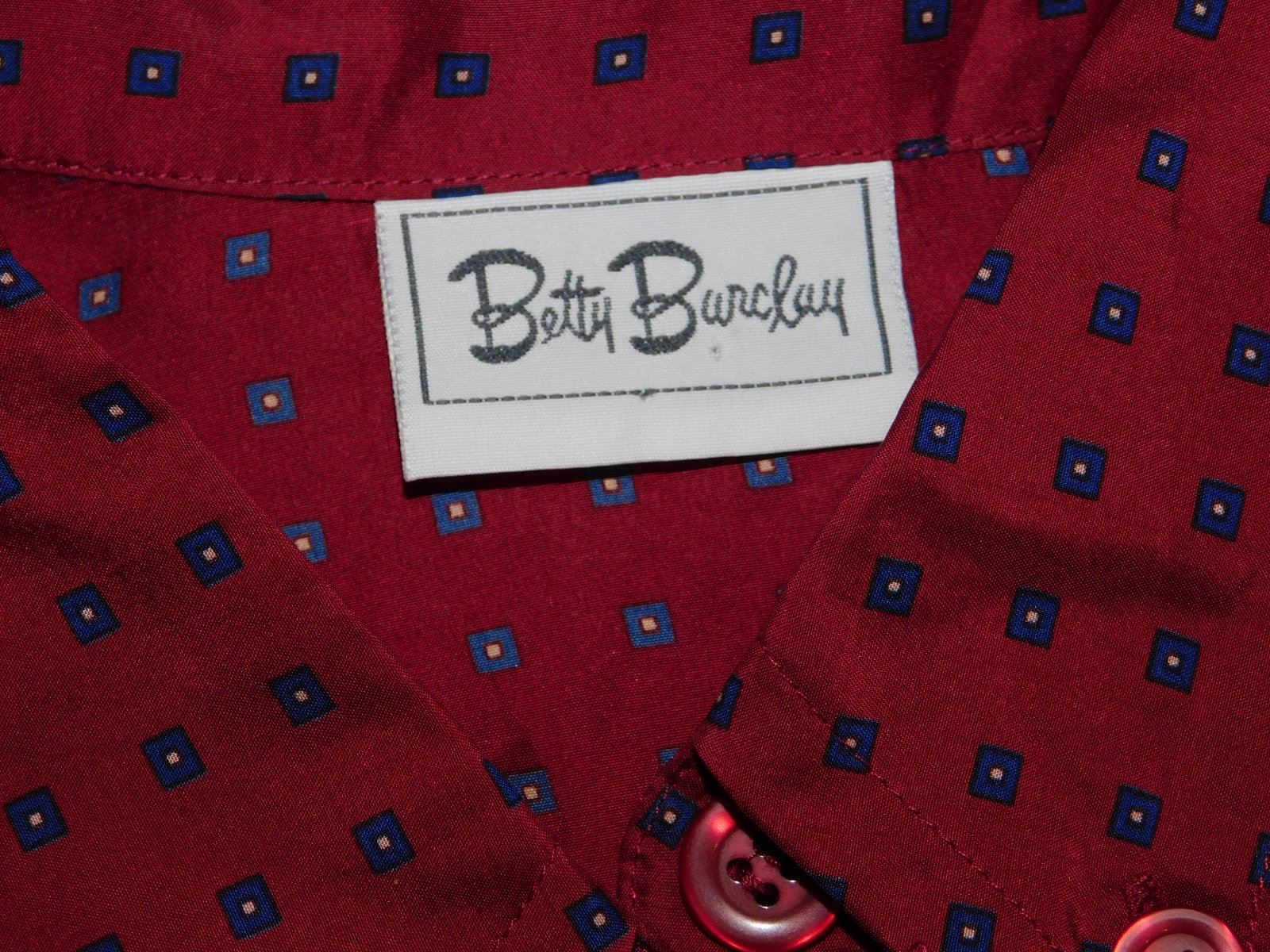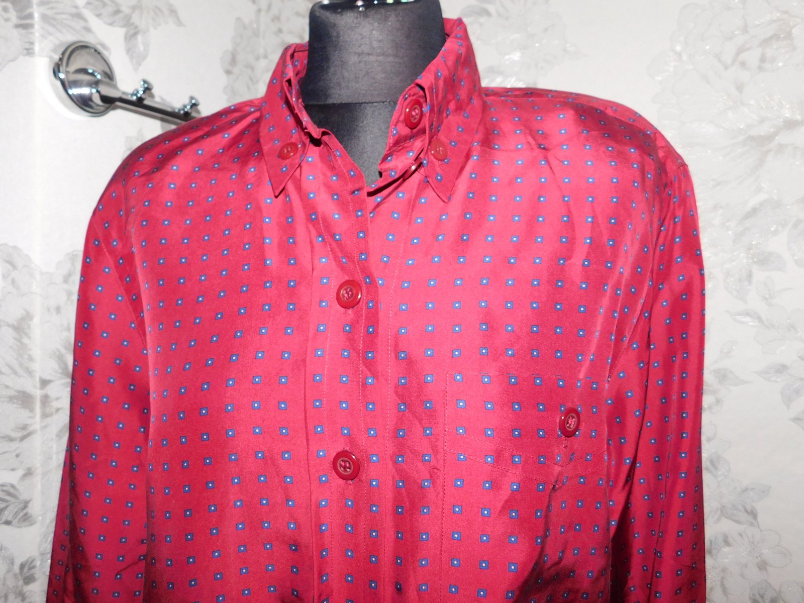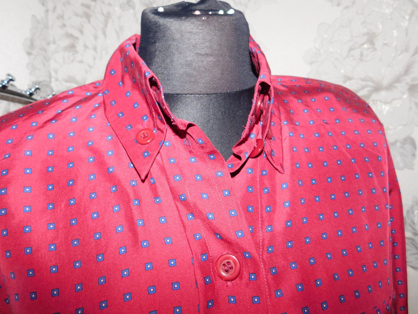 BETTY BARKLAY Luxusna hodvabna košelova bluzka bordovej farby so vzorom modrej farby.dole mala dieročka/pozri foto/inak ako nova. 100%hodvab. m