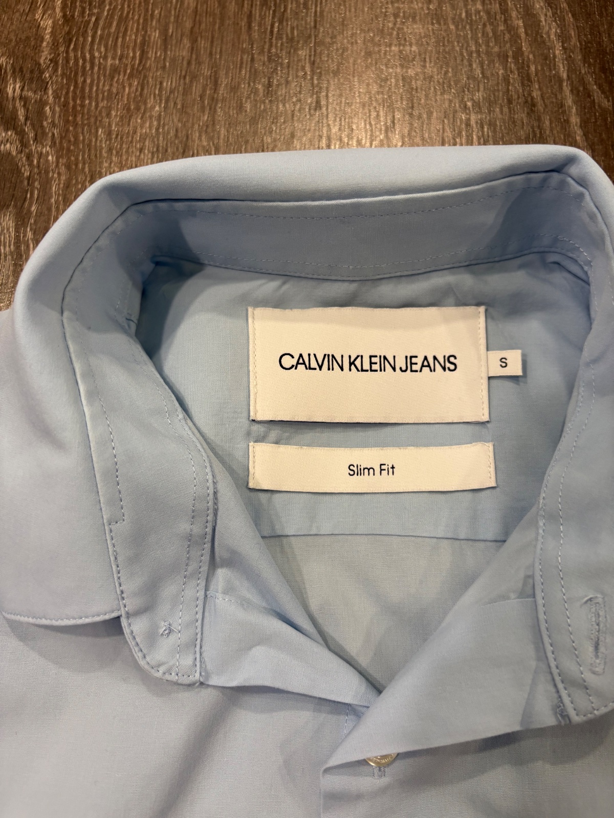 013.Calvin Klein panska slim fit kosela svetlomodrej farby,velkost S,dlzka prednej casti je 69cm,zadnej casti je 74cm,dlzka rukava od krku je 79cm a sirka v podpazusi je 48x2cm