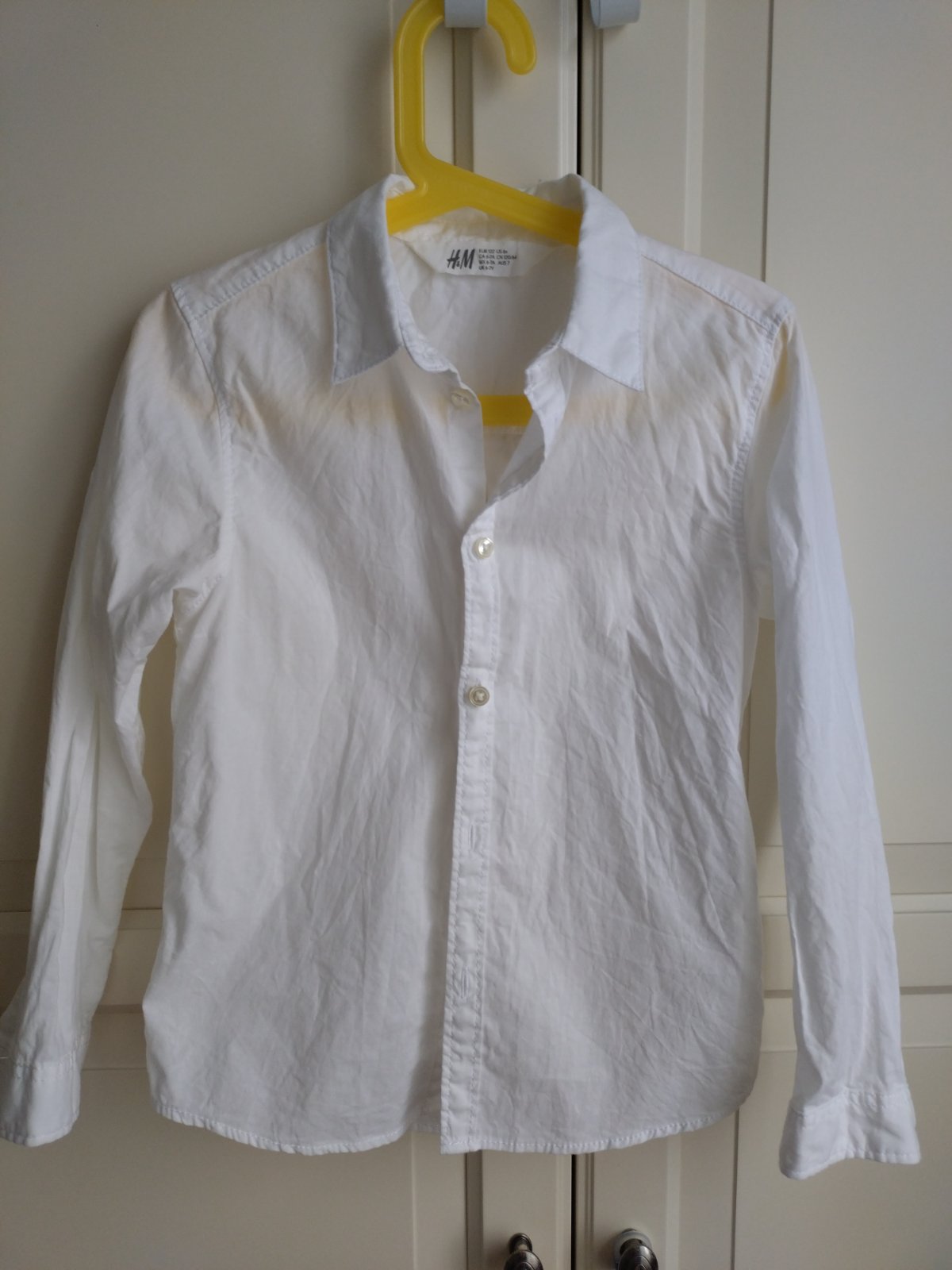 Príjemná biela košeľa s modrými pásikmi, možnosť vyhrnúť rukávy. Veľkosť 122, ale zdá sa mi menšia - rozmery na foto. Bez poškodení.