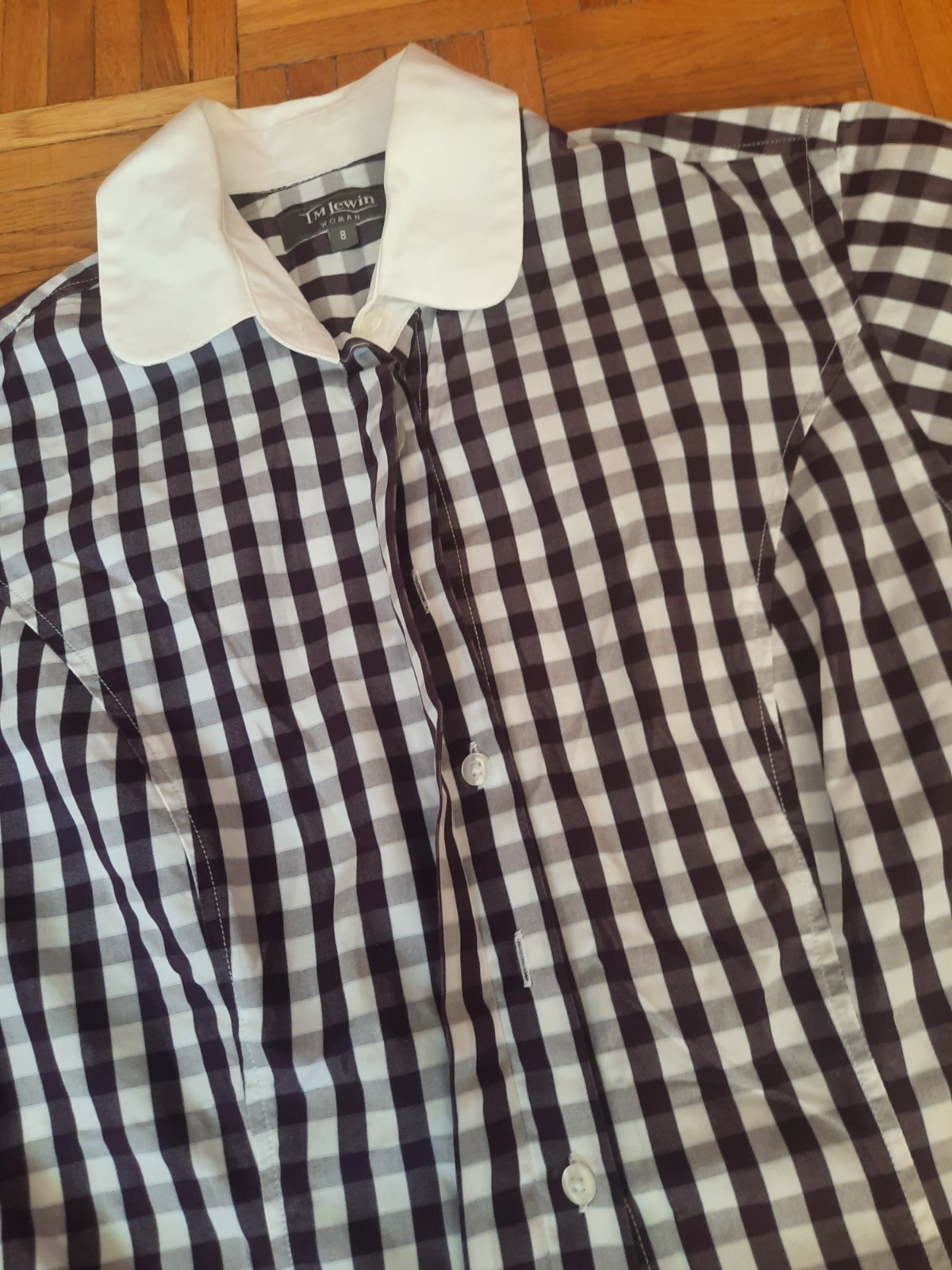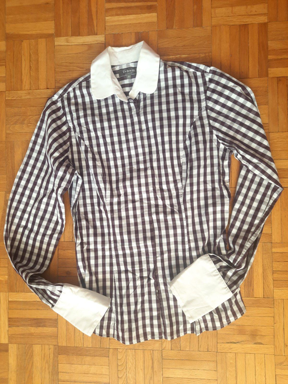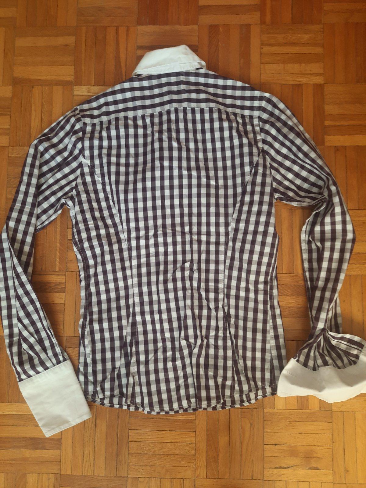 Dámska košeľa ( iba vypratá) so zapínaním na gombíky. Golier a manžety sú biele kombinované s baklazánovou farbou. Pekne priliehajú na postavu.