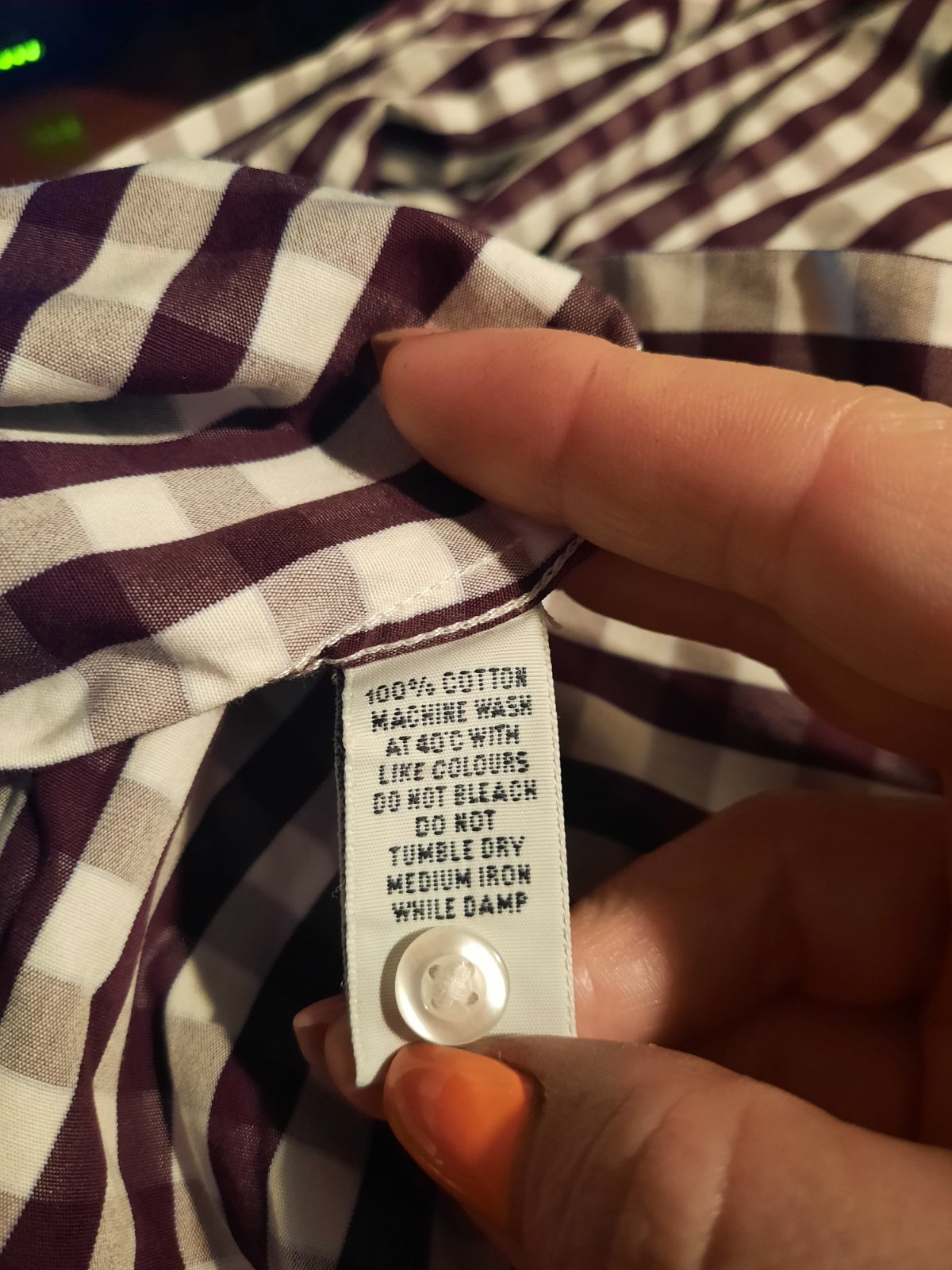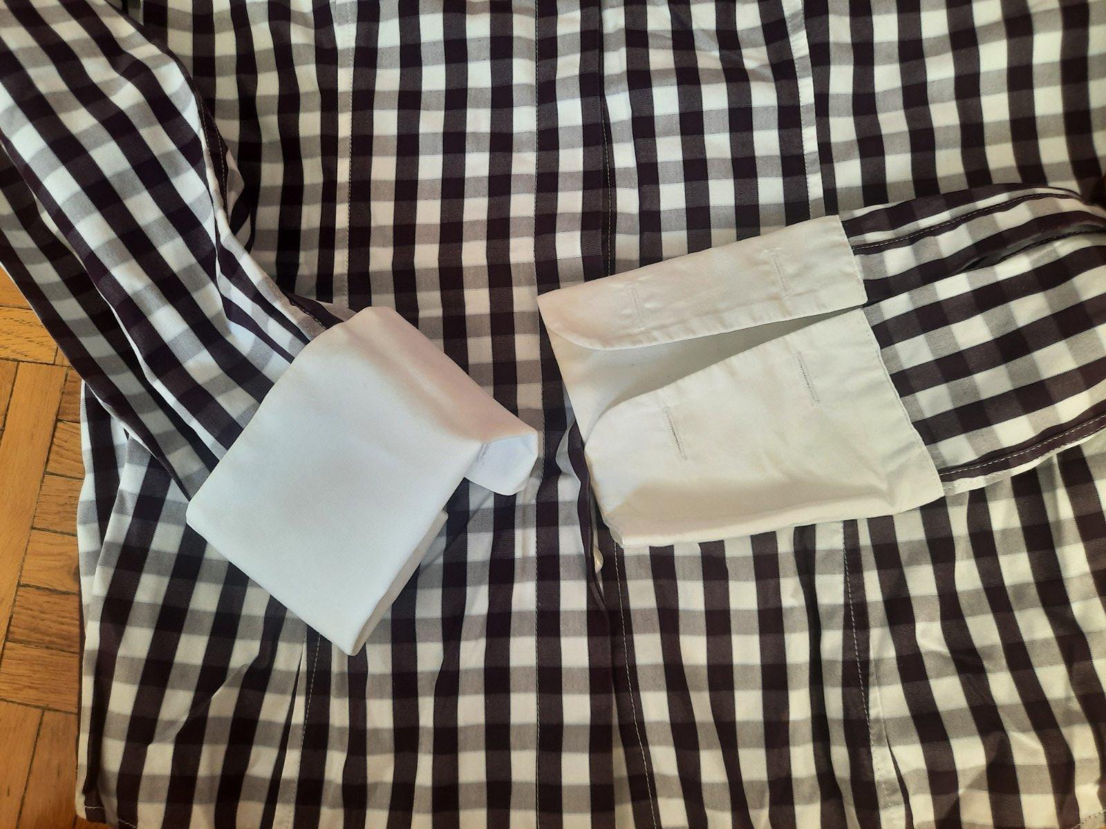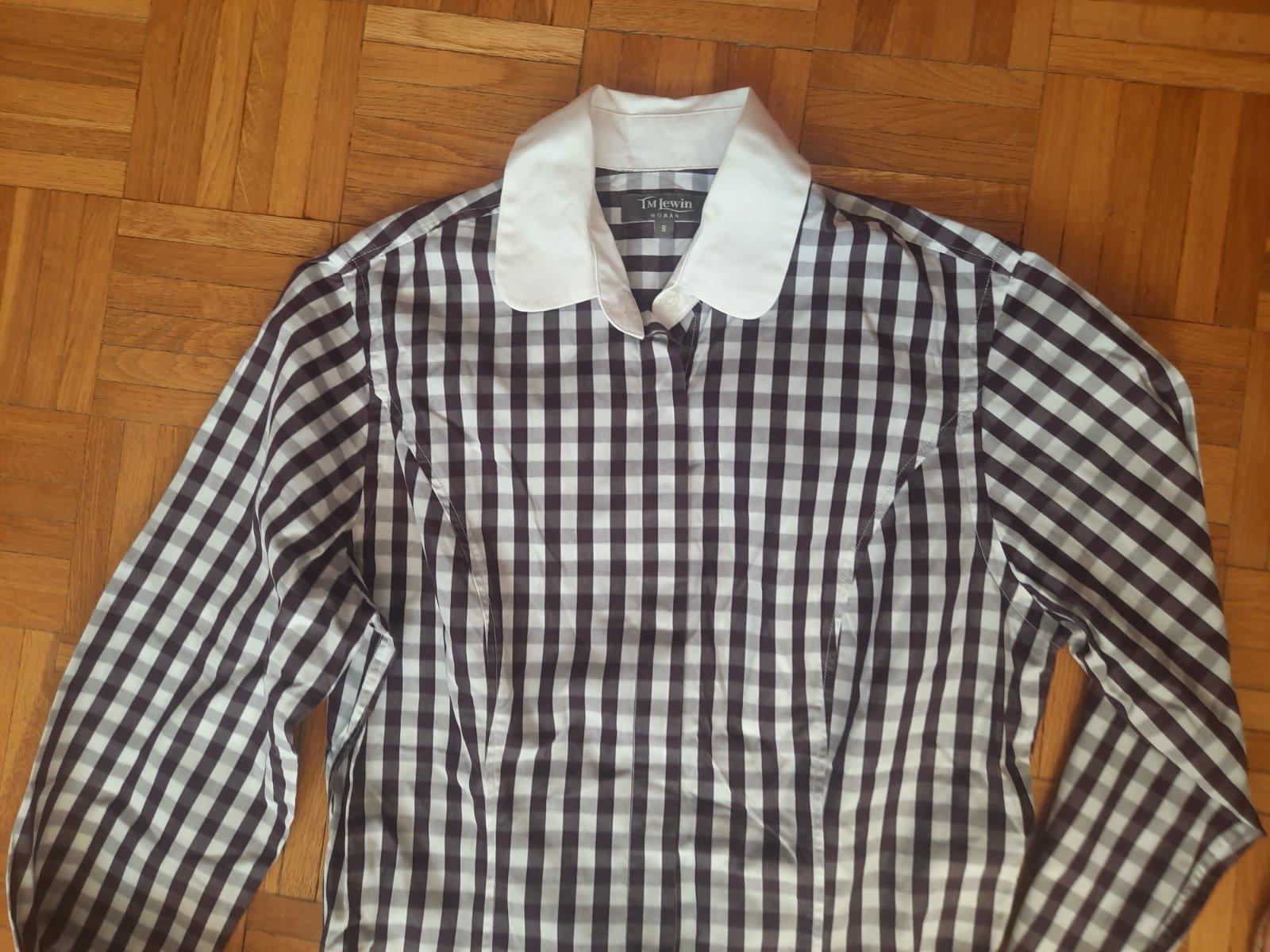 Dámska košeľa ( iba vypratá) so zapínaním na gombíky. Golier a manžety sú biele kombinované s baklazánovou farbou. Pekne priliehajú na postavu.