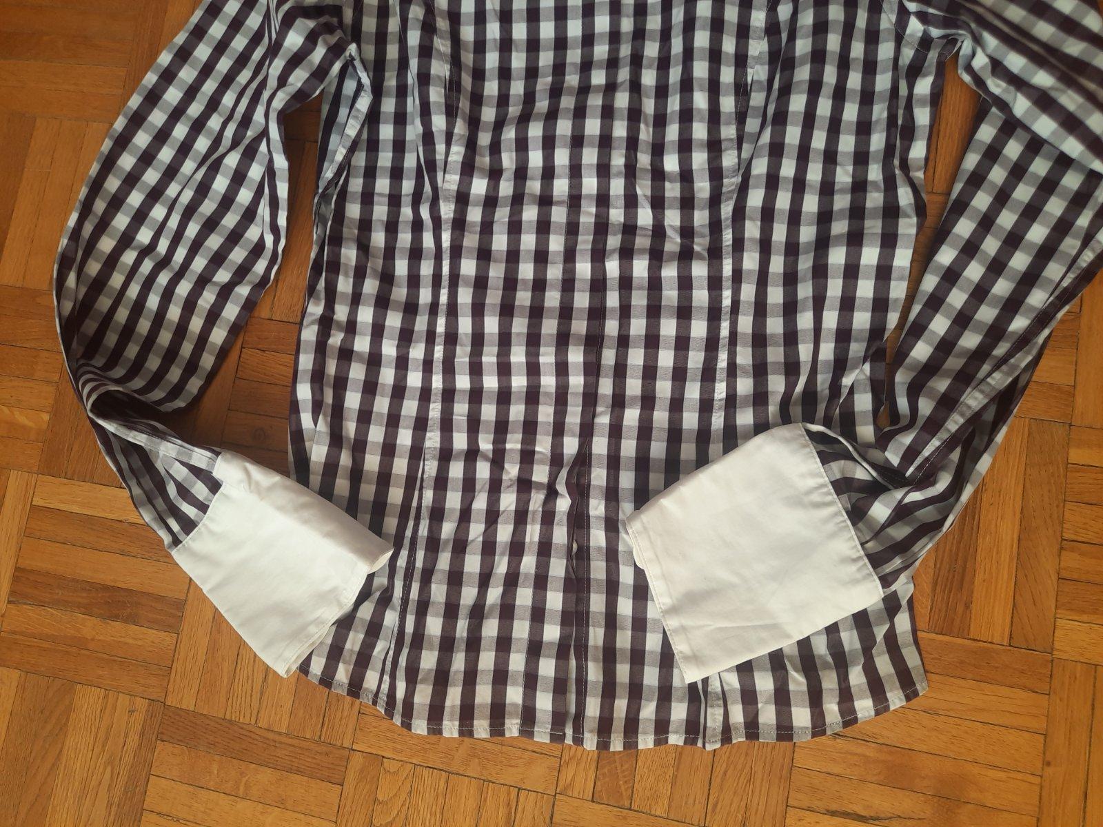 Párkrát oblečená košeľa bez poškodenia. Veľmi feši ukáže s riflami uviazaná v páse s vyhrnutými rukávmi. :) Celková dĺžka: 72cm (najvzdialenejšie body) Rukáv od krku: 66cm Šírka cez prsia: 2x47cm...