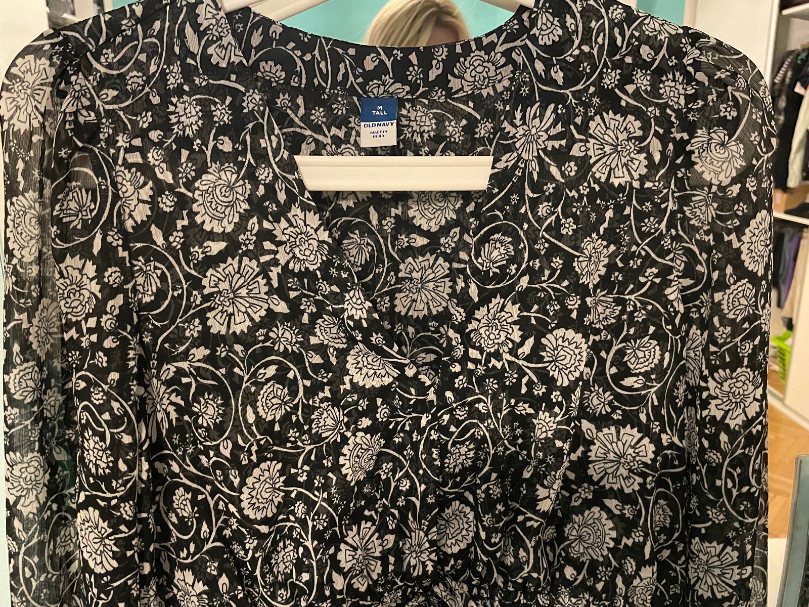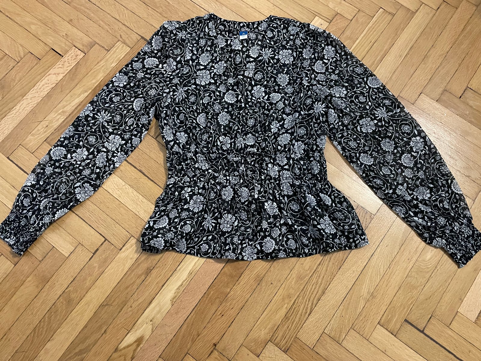 čiernobiela blúzka, kupovaná v USA, v páse sťahovacie gumičky a viazačka, príjemný, nekrčivý padavý materiál. V´daka strihu sa prispôsobí každej postave. Blúzka je nová nenosená
