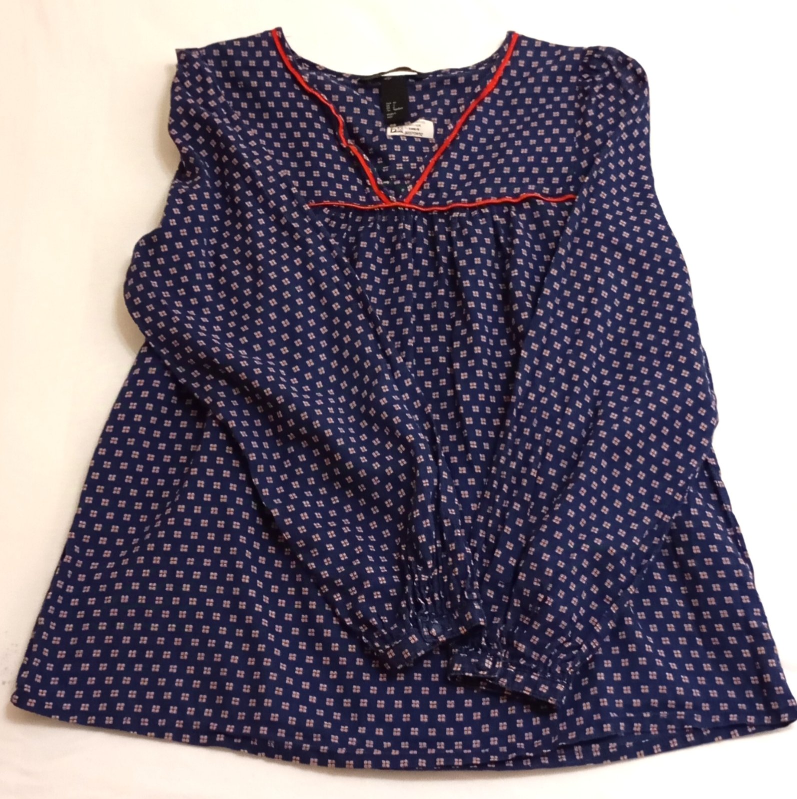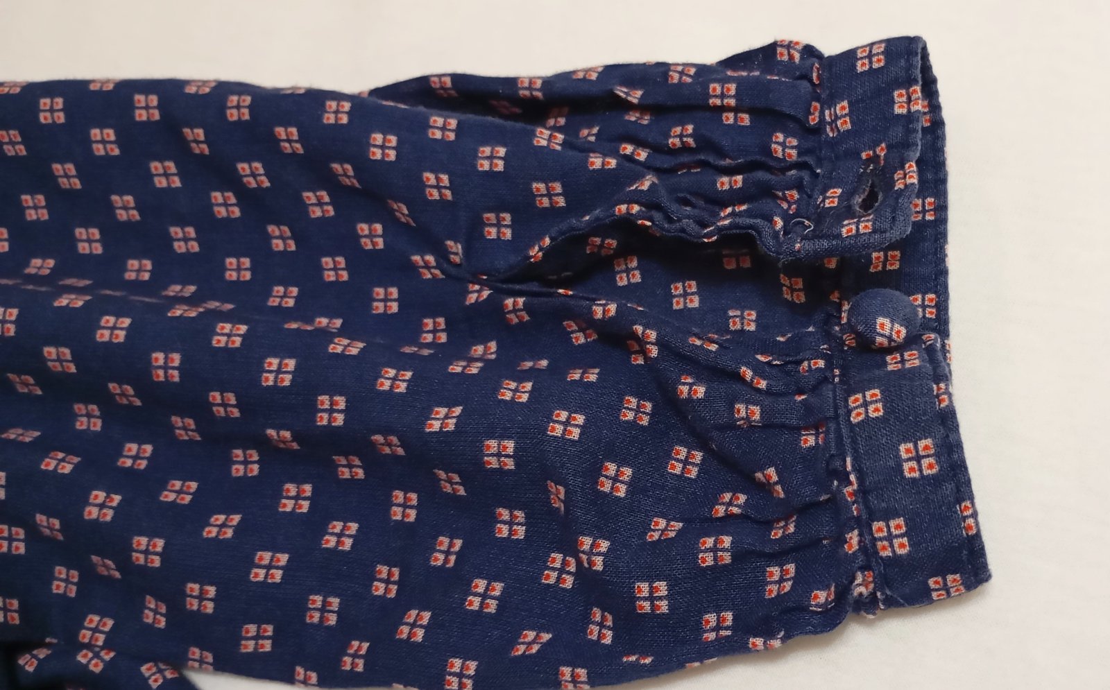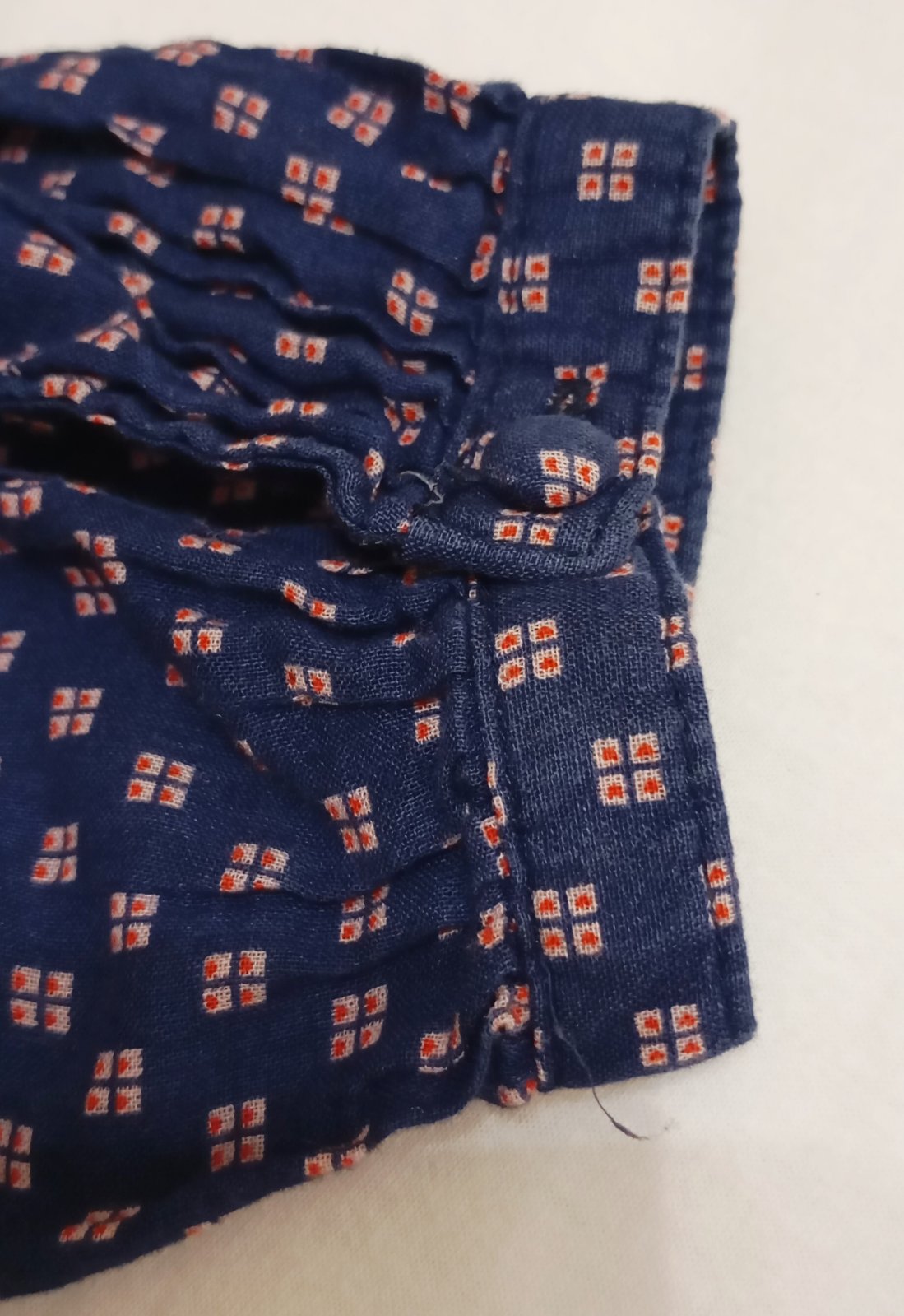 Tenká indigová/tmavomodrá blúzka vo voľnom vzdušnom strihu s dlhým rukávom. Golier je vykrojený do tvaru písmena V (tzv. "V-neck") a je lemovaný červenou niťou. Vzor látky tvoria drobné štvorčeky v červenej a bielej farbe. Zapína sa dvomi gombíkmi na manžetách rukávov okolo zápästia, jeden náhradný gombík je prišitý zvnútra na štítku.