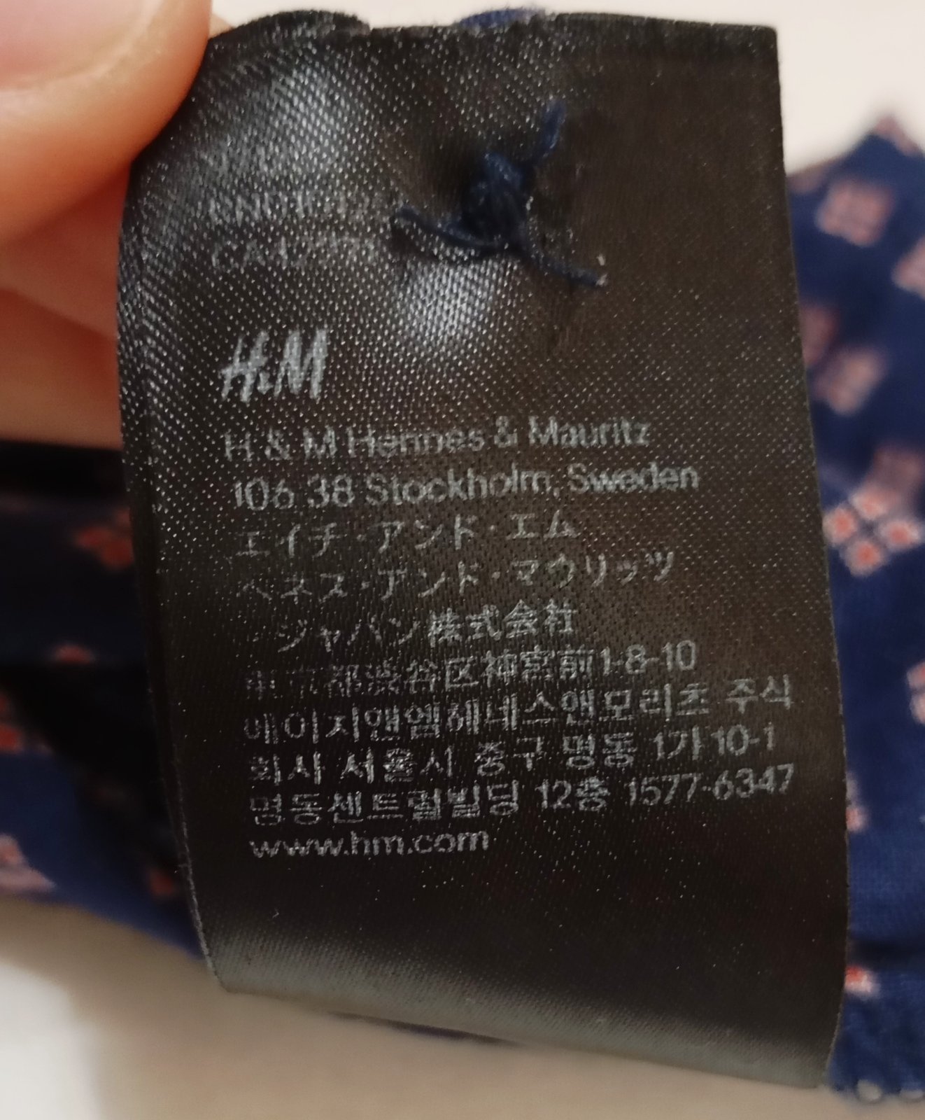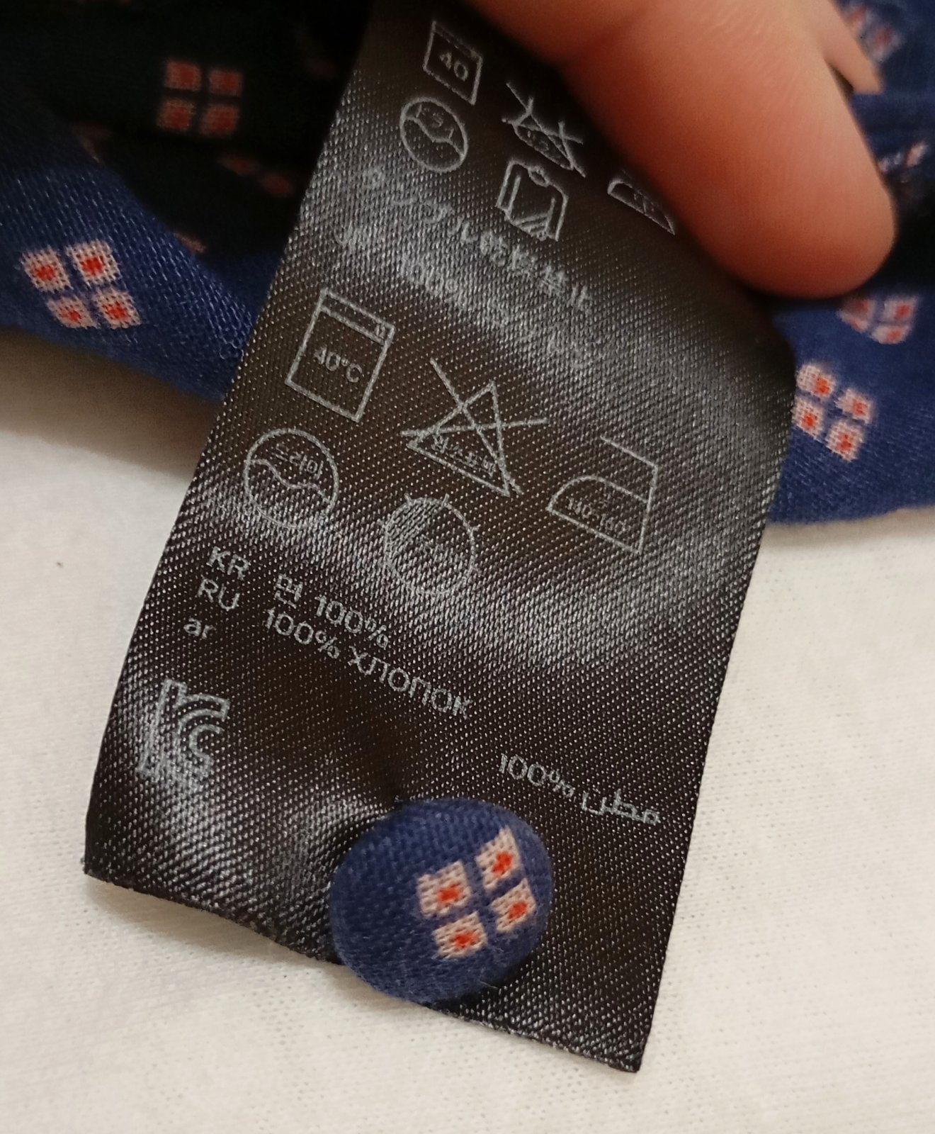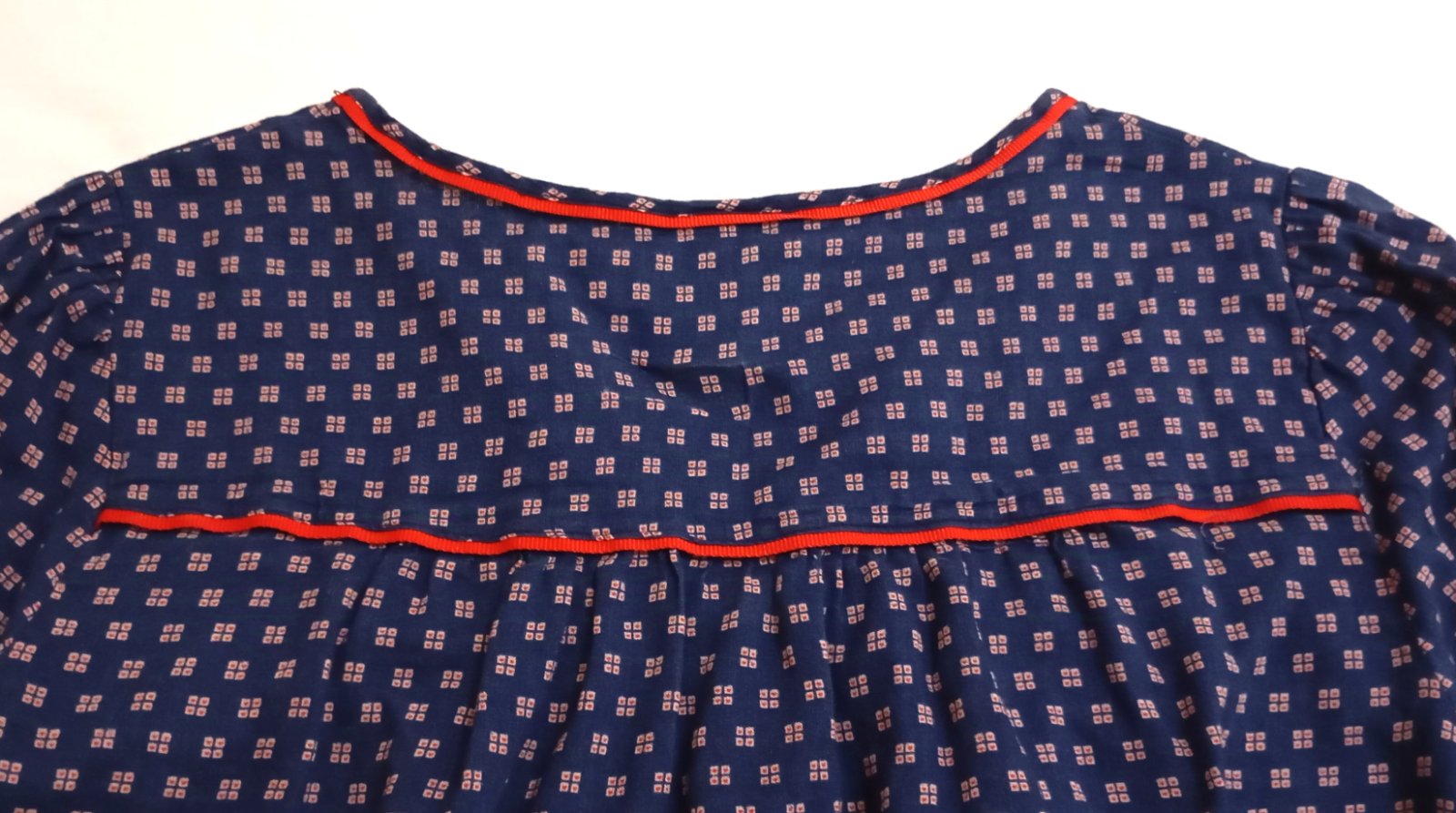 Tenká indigová/tmavomodrá blúzka vo voľnom vzdušnom strihu s dlhým rukávom. Golier je vykrojený do tvaru písmena V (tzv. "V-neck") a je lemovaný červenou niťou. Vzor látky tvoria drobné štvorčeky v červenej a bielej farbe. Zapína sa dvomi gombíkmi na manžetách rukávov okolo zápästia, jeden náhradný gombík je prišitý zvnútra na štítku.