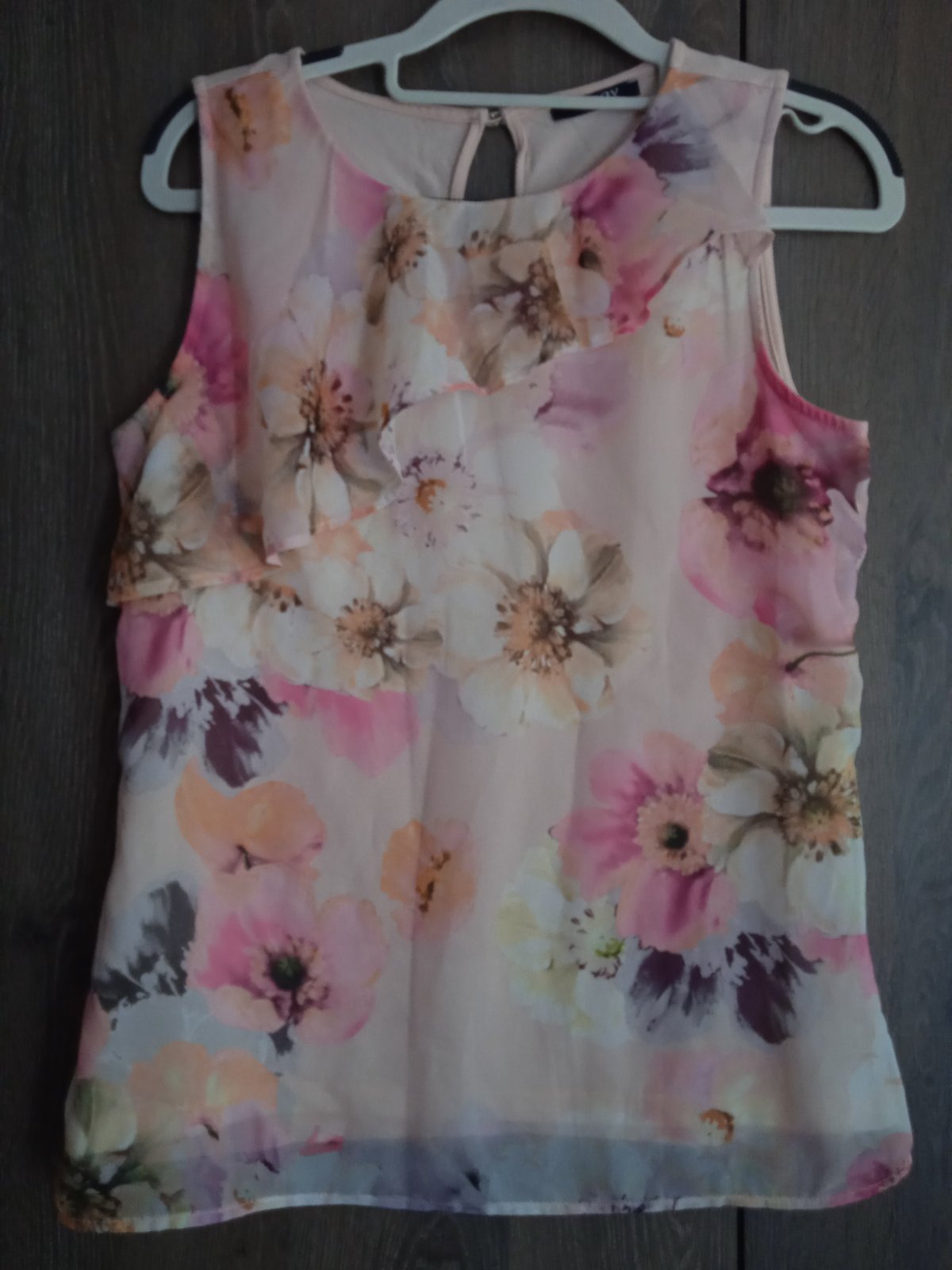 Jemné priesvitná letná blúzka, štítok je odstrihnutý, veľkosť len odhadujem. Rozmery sú nafotené. Vpredu som našla dve drobné zatiahnutia.