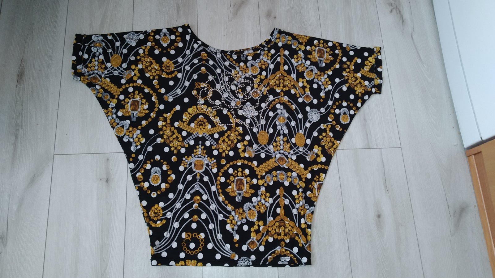 Rozmery: dĺžka blúzky je 73 cm, šírka v oblasti podpazušia 2x64 cm (voľný padavy strih), šírka v oblasti pása 2x48 cm.