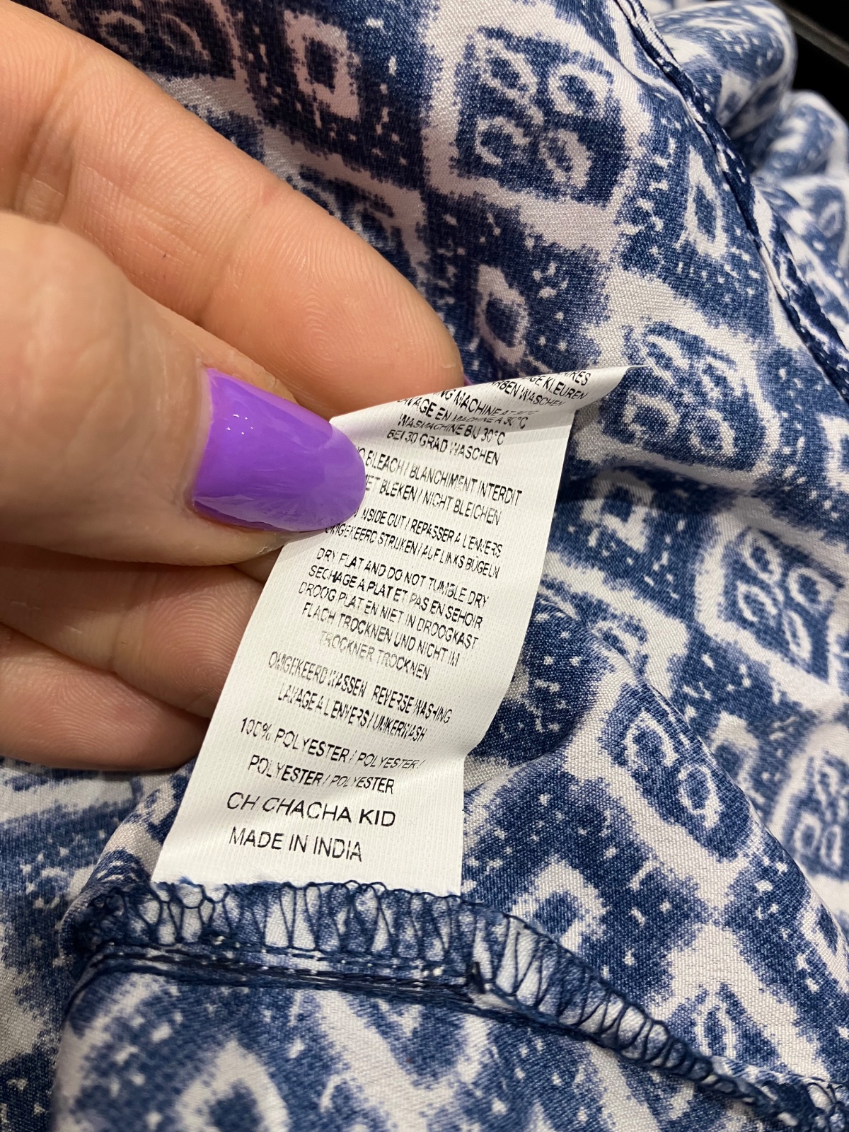Dievčenská tmavomodrá ľahká blúzka na tylové ramienka, voľný strih, ležérna, špagetové ramienka s tylom, výstrih na gumičku, tenká, vzorovaná, nie je elastická, dvojité číslovanie. Materiál:100%polyester.
