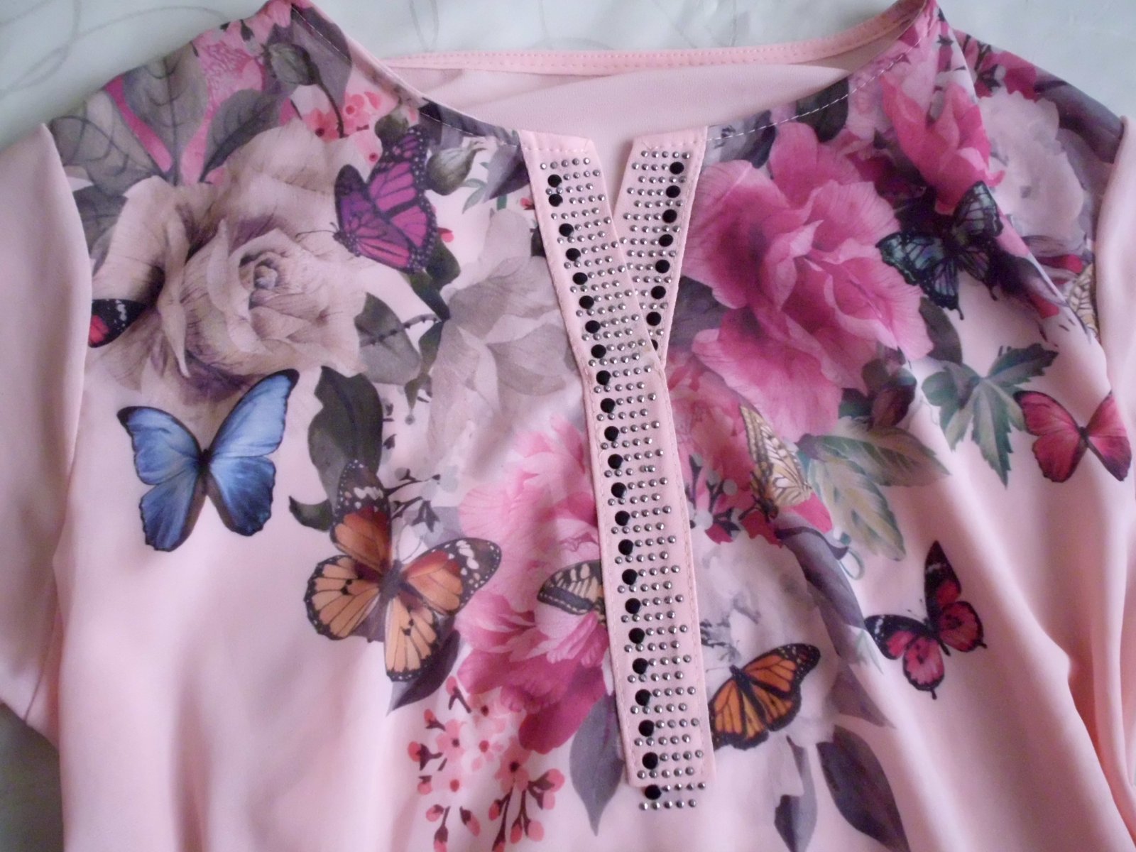 Predám dámsku blúzku Italy , vel. M-L šírka 55 cm, dĺžka 66 cm, rukáv od pleca 62 cm, príjemný materiál, vnútri všité tenučké tričko na ramienka, ružový podklad + farebné kvety , 100% top stav