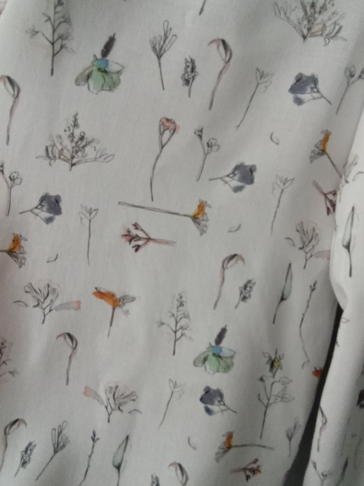 Super stav, tenšia biela blúzka so vzorom drobných kvietkov.