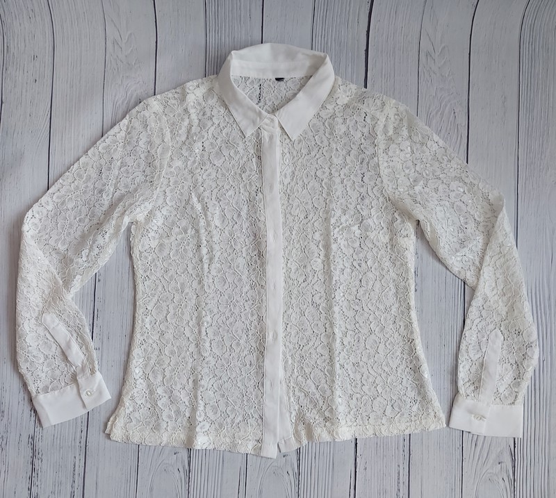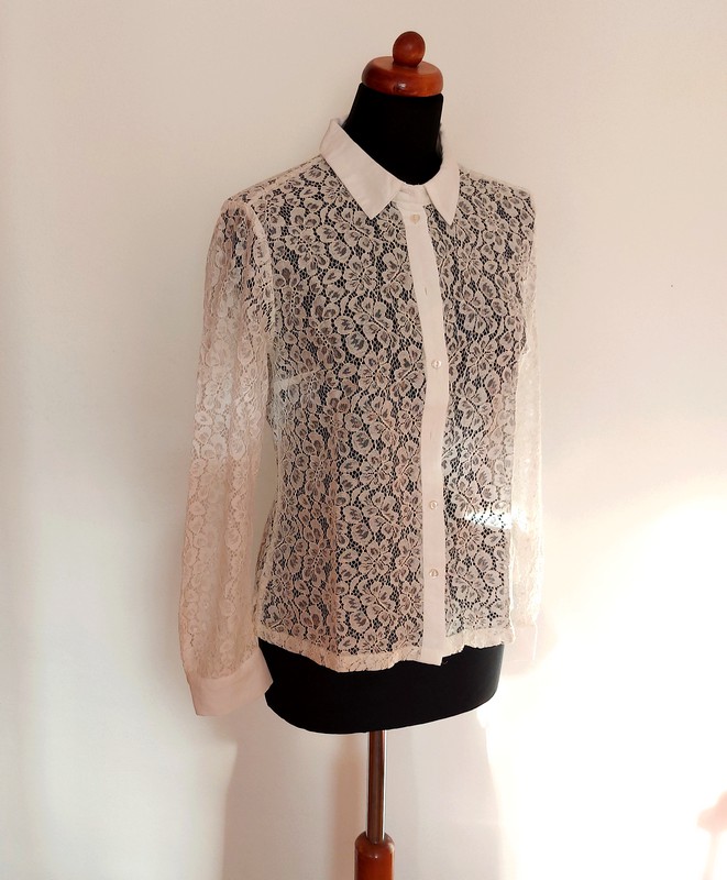 Čipkovaná blúzka, košeľa. Vyzerá elegantne do saka alebo samostatne. Veľkosť M odhadom, štítky kôli priesvitnosti boli odstránené. Pod pazuchami 2x47cm, dĺžka 59cm. Nie je elastická. Asi 2 x oblečená, veľmi dobrý stav.