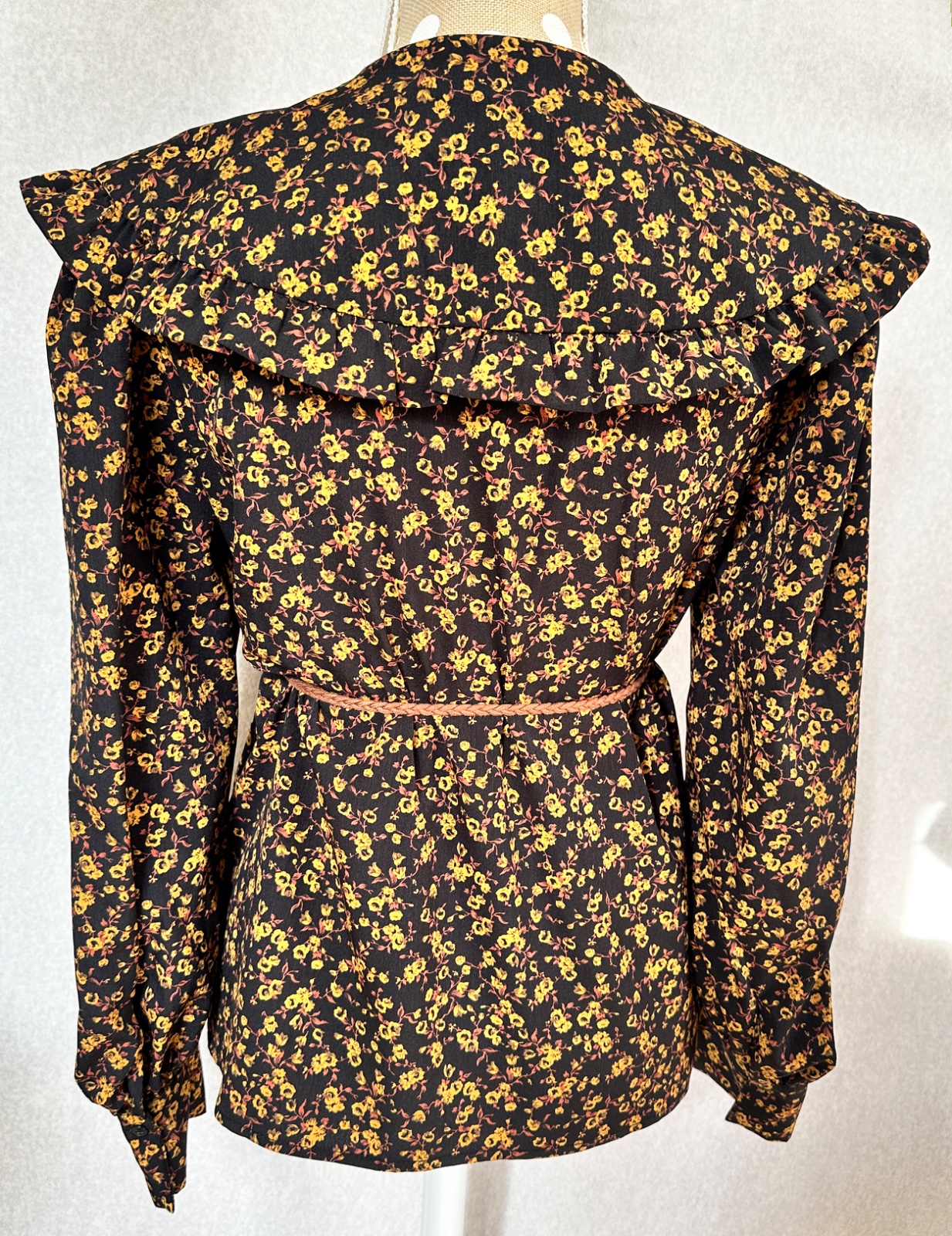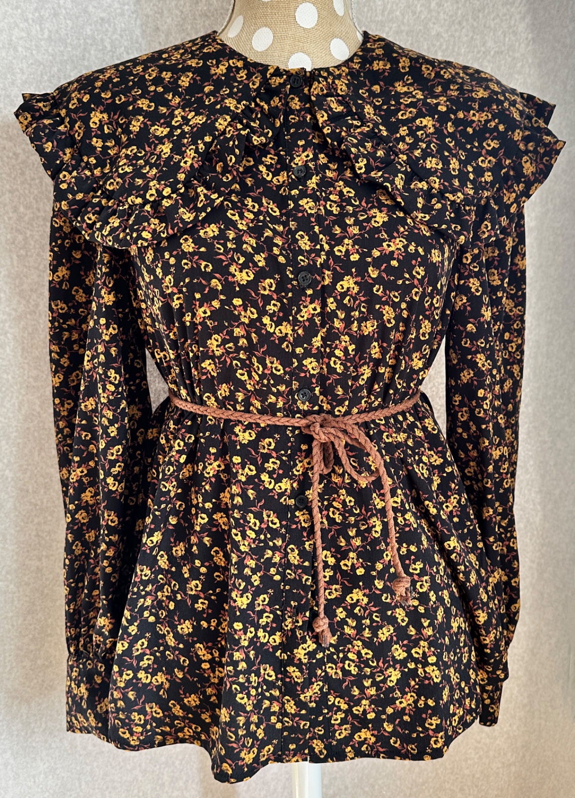 Štýlová blúzka s výrazným volánovým golierom. Rukávy sú nariasené na ramenách aj v patentoch. Materiál je príjemný, hebký, nekrčivý, padavý. Oblečená pôsobí bohémsky.
