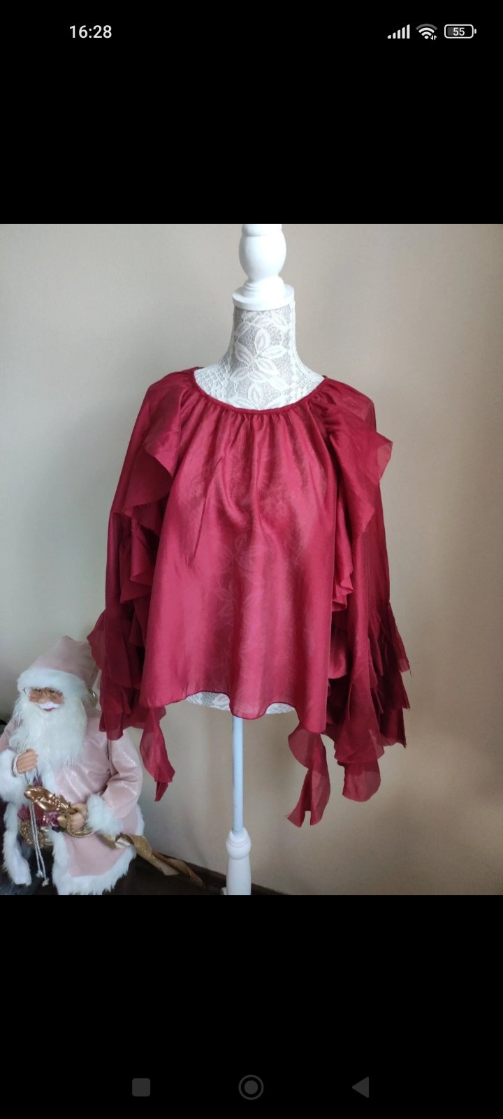 krasna bluzka s ozdobnym golierom, rukavy su akoby z krajky