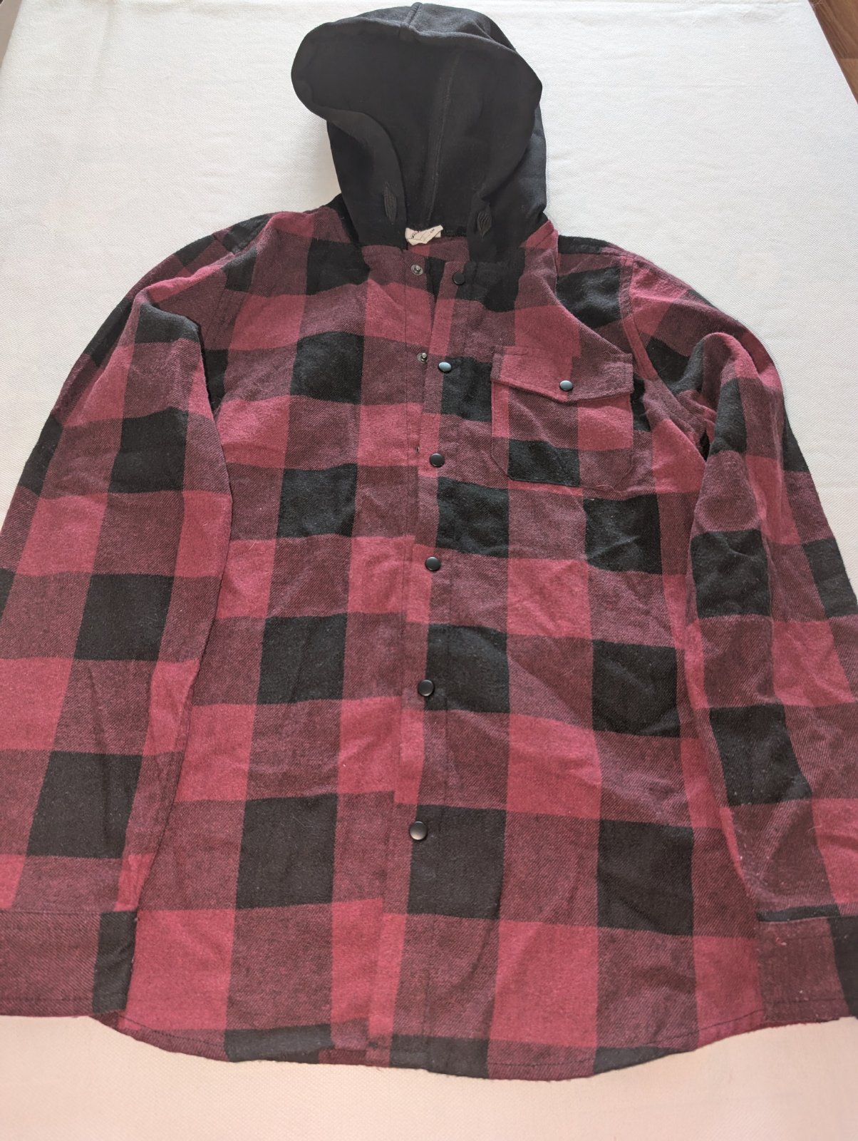 Párkrát oblečená košeľa so vsadenou kapucňou. Zapínanie na cvoky. Nenašla som žiadne poškodenie. Podľa potreby premeriam.
