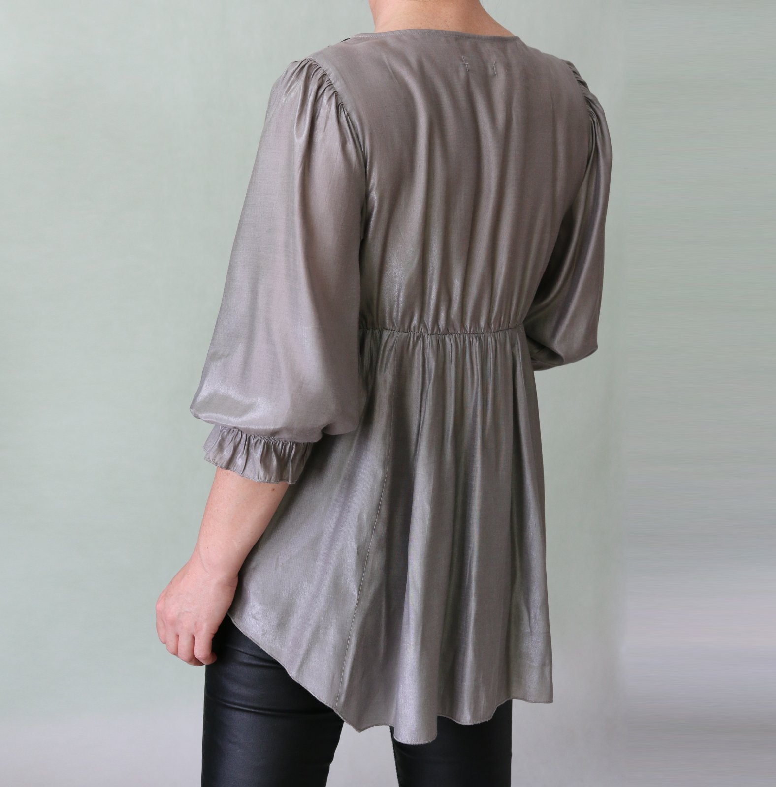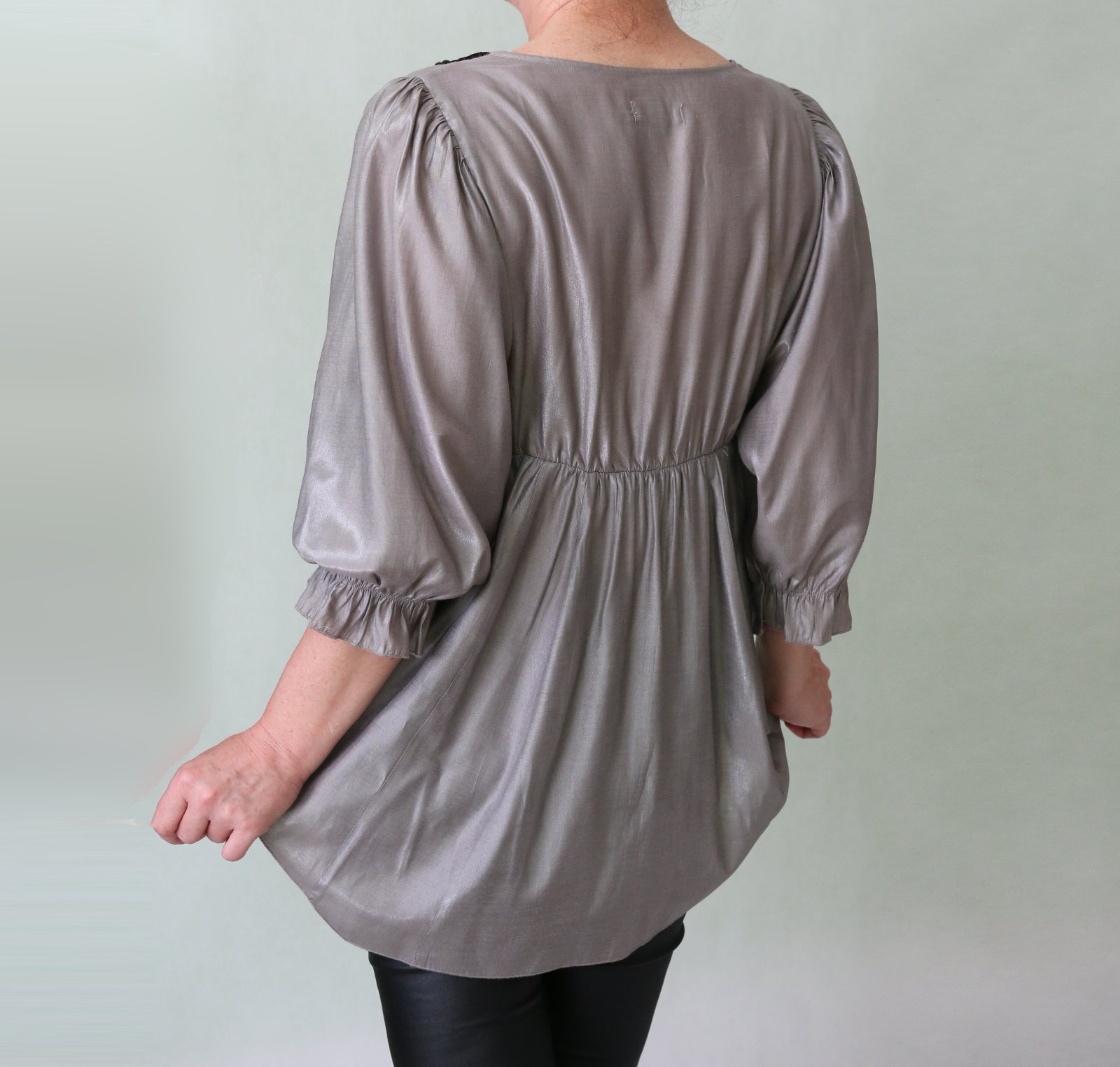 Tunika s balonovými rukávmi k lakťom, akoby saténová, ale materiál je viac meňavý a nie tak klzký. Sedlo a vsadky pošité čiernou čipkou. Nebola nosená, super stav. Materiál 58% polyester, 42% viskóza. Veľkosť 36/38, sedí skor na 38 až 40. Rozmery rada zašlem. Odoslánie poštou alebo Packetou, cenu za odoslanie napíšem.