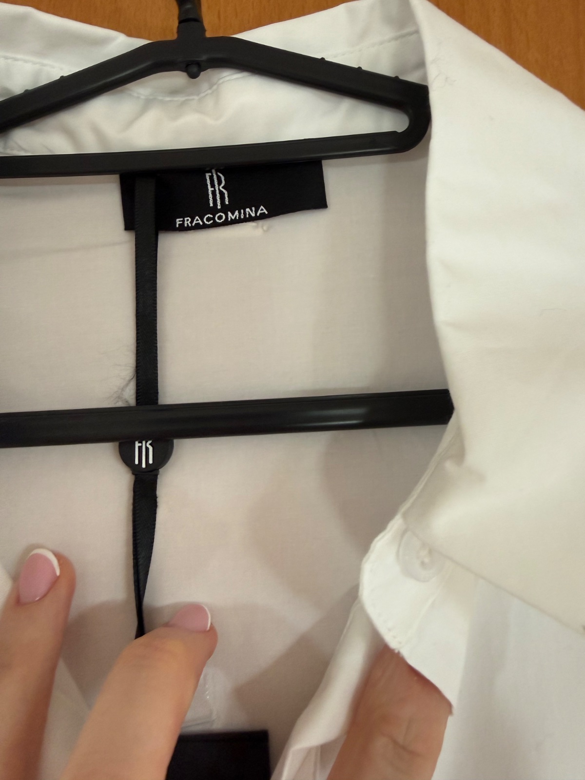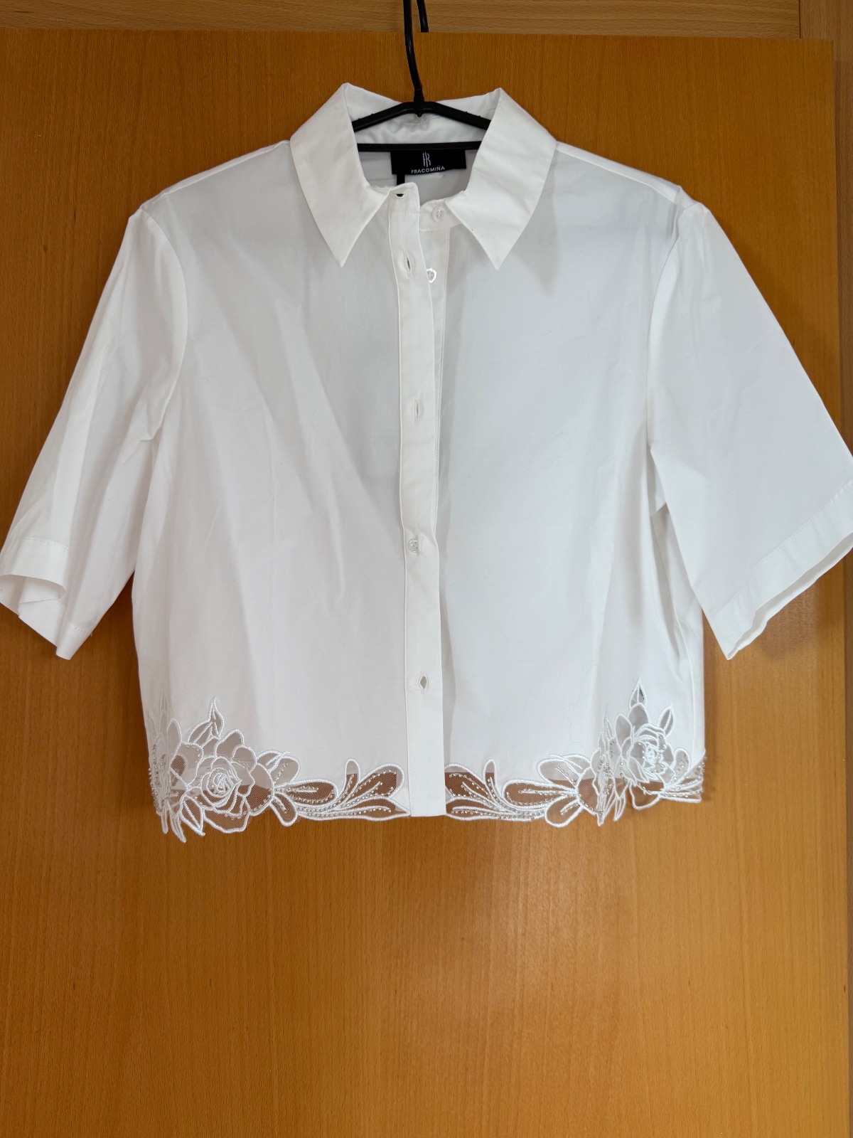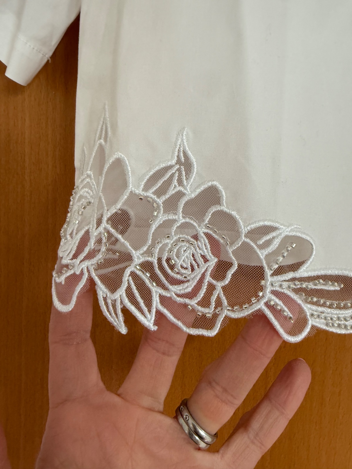 Krásna košeľa do pása mierne voľnejšieho strihu značky Fracomina. Zapínanie má na gombíky. V spodnej časti je zdobená čipkovou výšivkou na jemnom tylovom podklade s drobnými striebornými korálikmi.