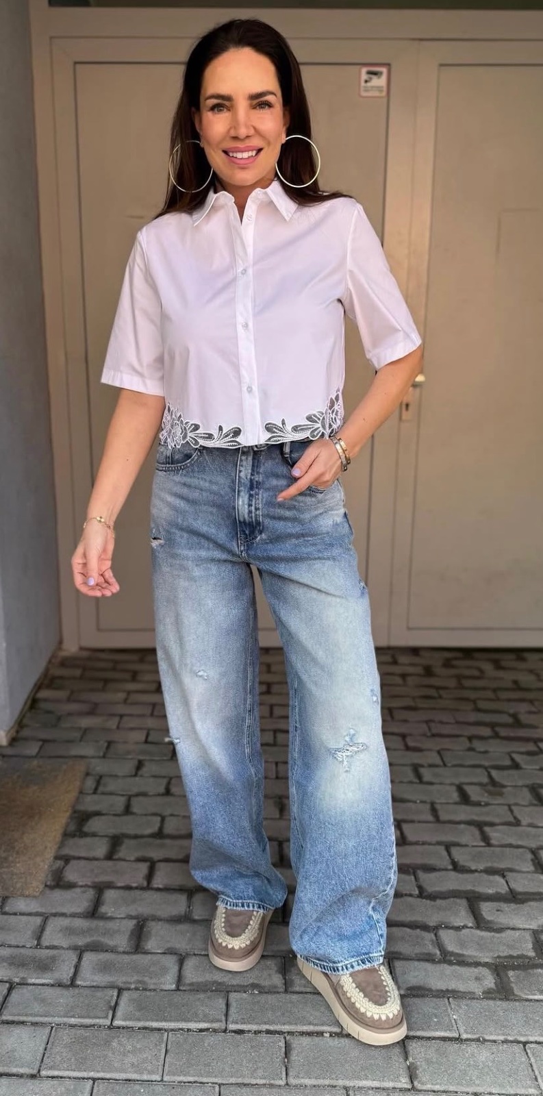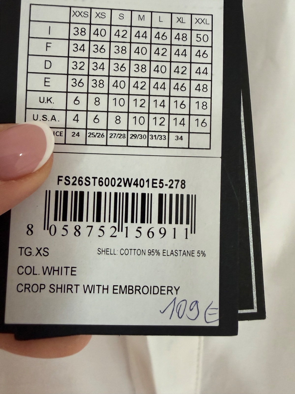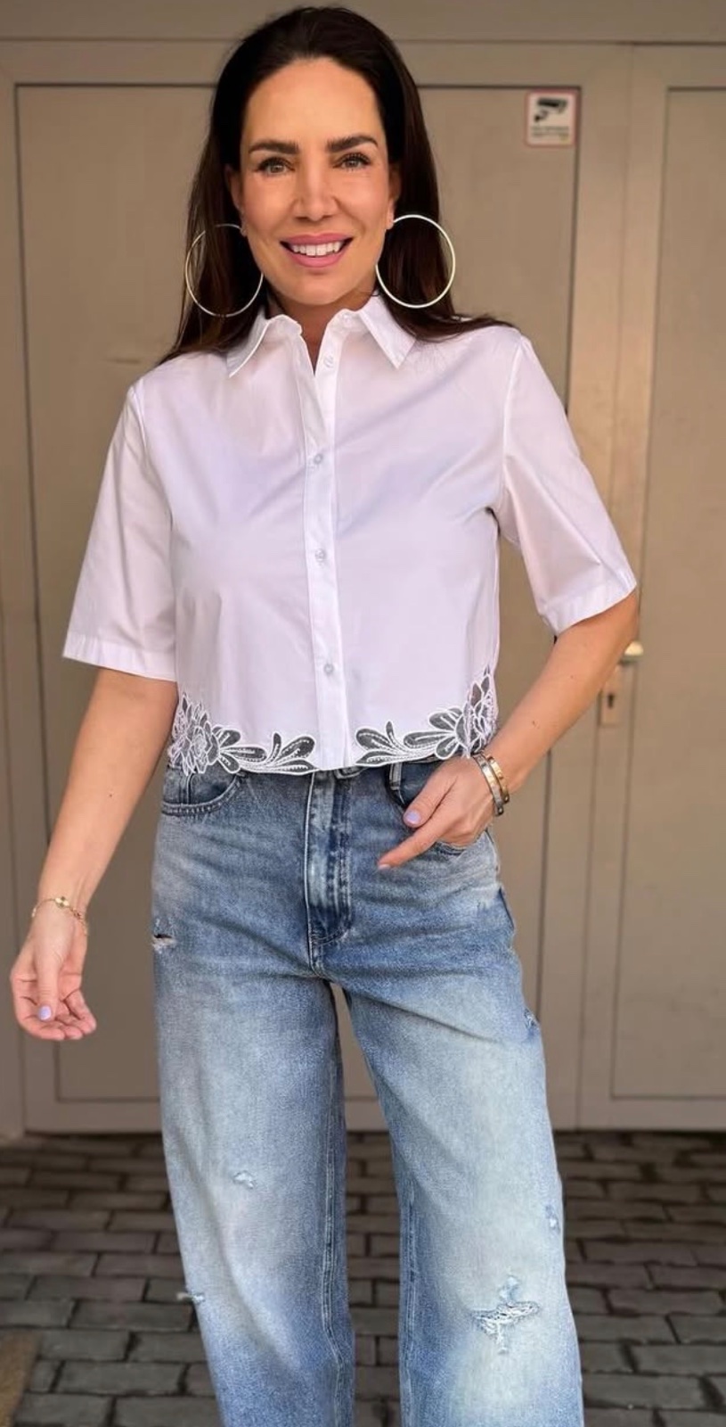 Krásna košeľa do pása mierne voľnejšieho strihu značky Fracomina. Zapínanie má na gombíky. V spodnej časti je zdobená čipkovou výšivkou na jemnom tylovom podklade s drobnými striebornými korálikmi.
