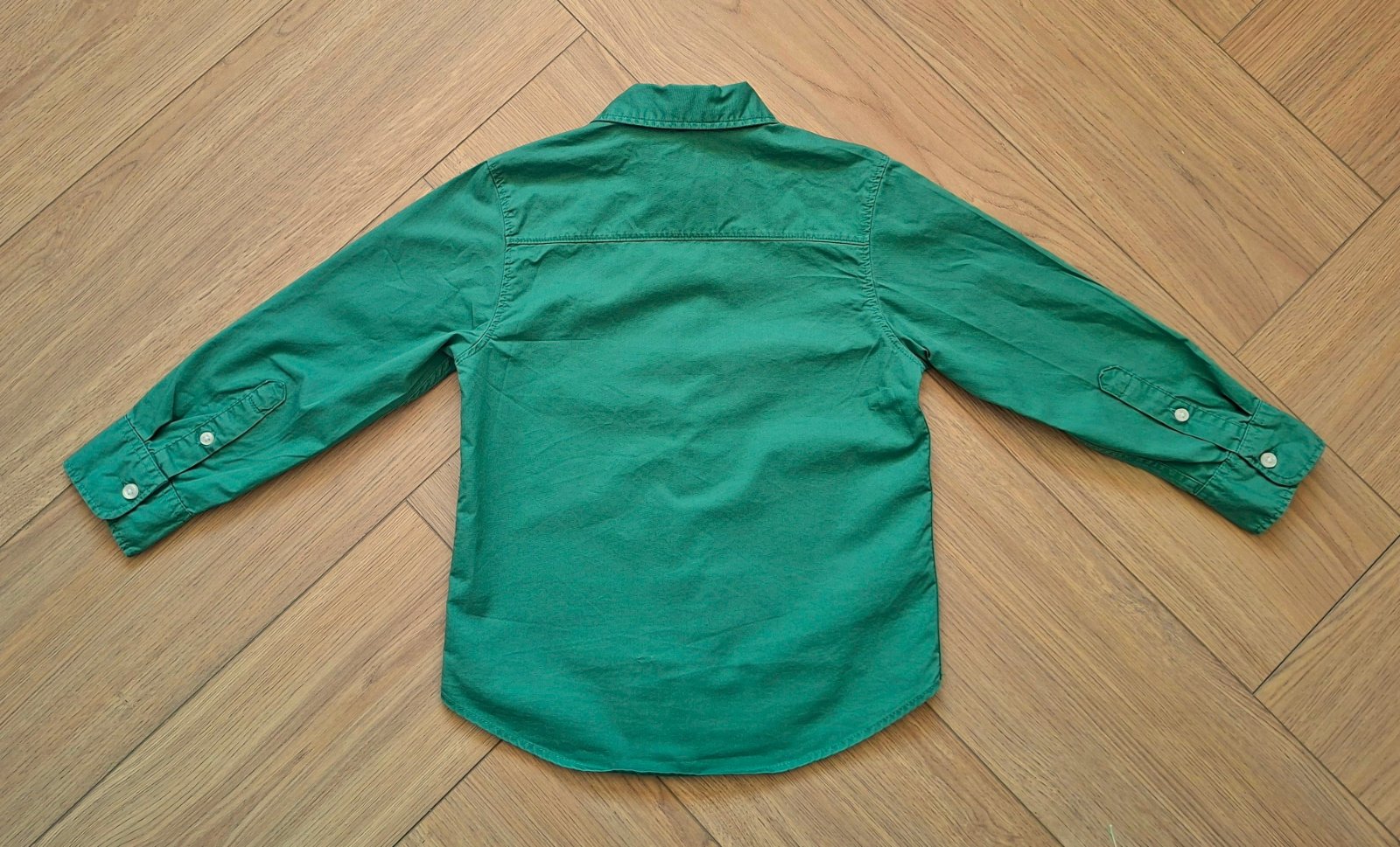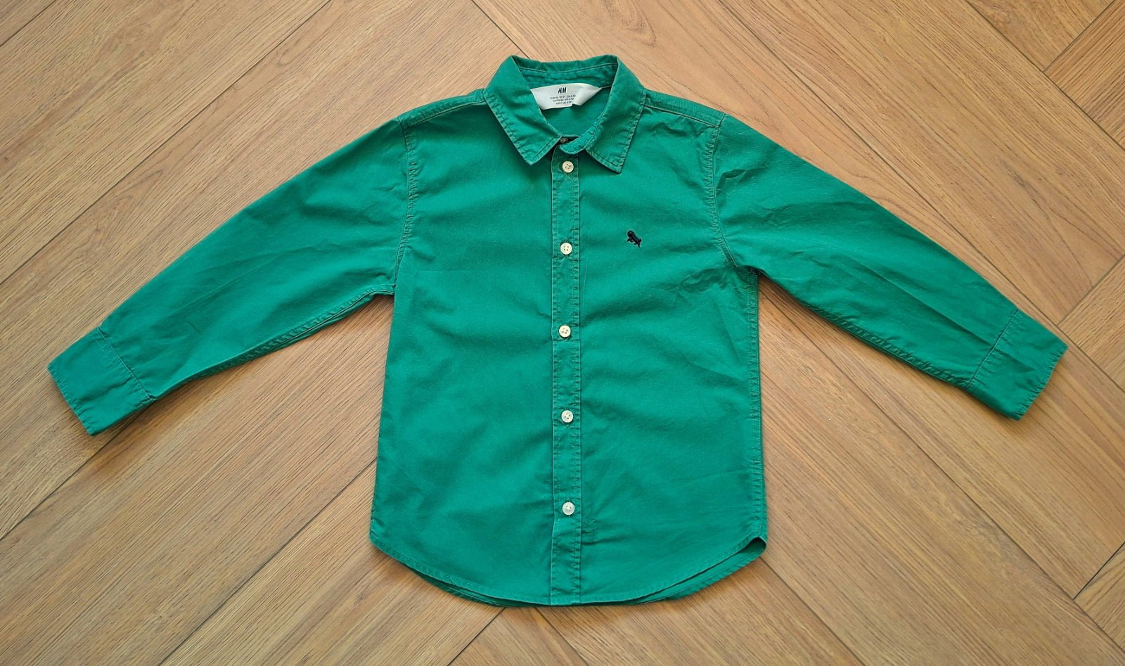 Chlapčenská košeľa zo vzdušnej, tkanej bavlnenej látky vo veľmi dobrom nosenom stave (bez dierok, fliačikov a žmolkov; jemnulinko spratá). Značka: HM; veľkosť: 110 (4 - 5 rokov).