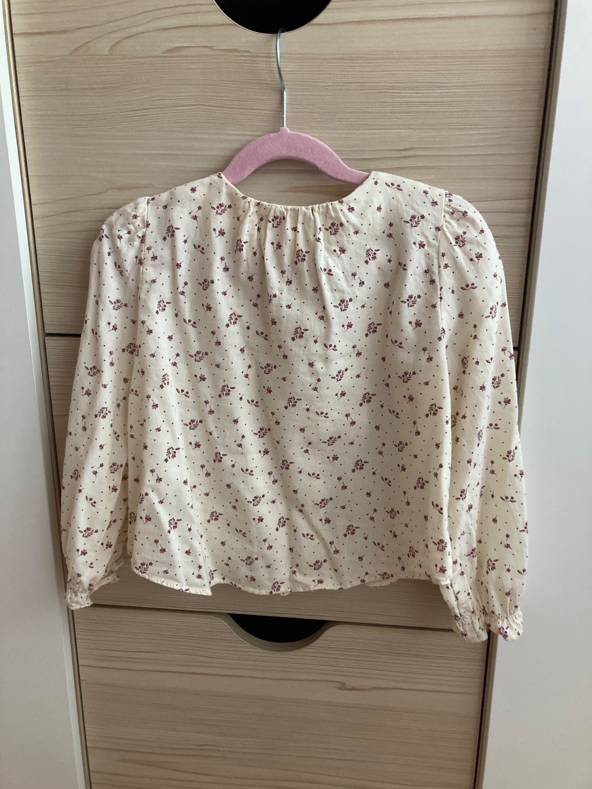 Ponukam na predaj bluzku/koselu Zara, na béžovom podklade je potlac malých fialových kvietkov. Visacka udava velkost 122, bluzka ale sedí na max na 116. Preto ju dcérka ani nenosila, lebo jej bola mala. Objednaná na black friday. Keďže som ju vyprala a az potom som ju dala vyskúšať, vrátenie už nebolo možné.