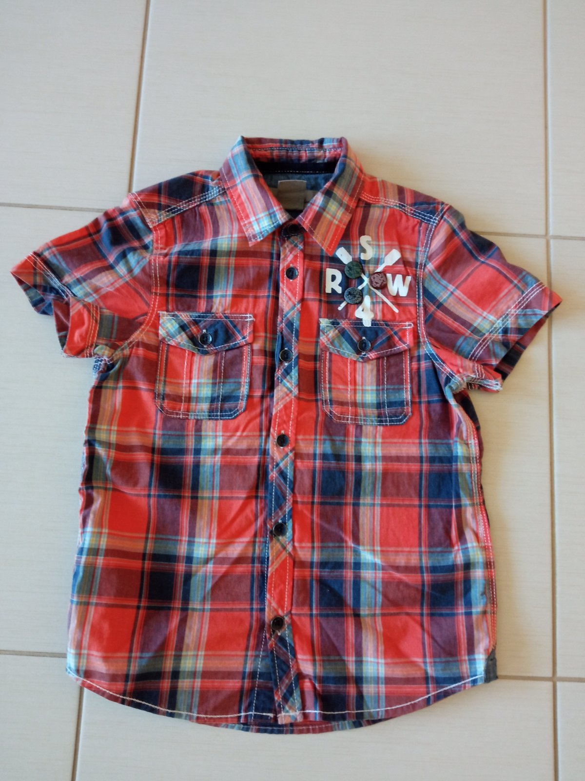 Ponúkam na predaj chlapčenskú košeľu s krátkym rukávom cca 122. Výška 48cm, šírka 2x37cm, golier 4,5cm, dĺžka rukáva od krku 25 cm, od ramena 16cm. Nepoškodená, vo veľmi dobrom stave.