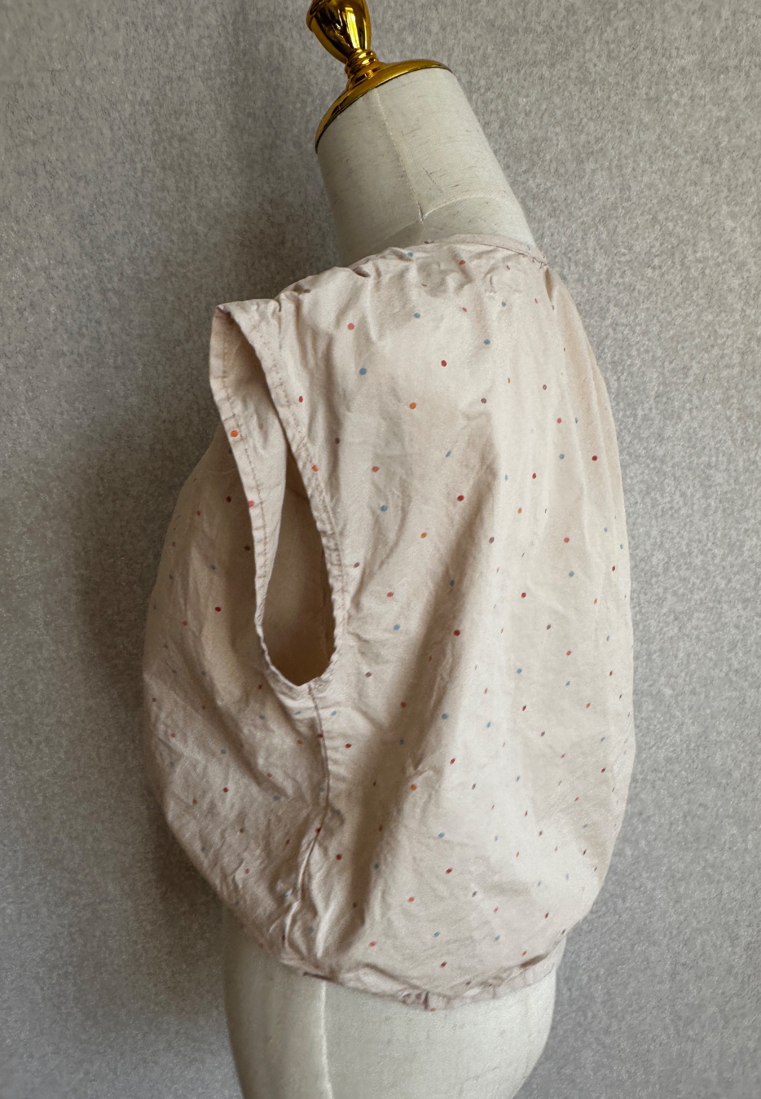 Blúzka v jemnej pastelovej béžovej farbe s drobnými farebnými bodkami. 100% bavlna, pranie pračke 40°C. V super stave, bez poškodení.