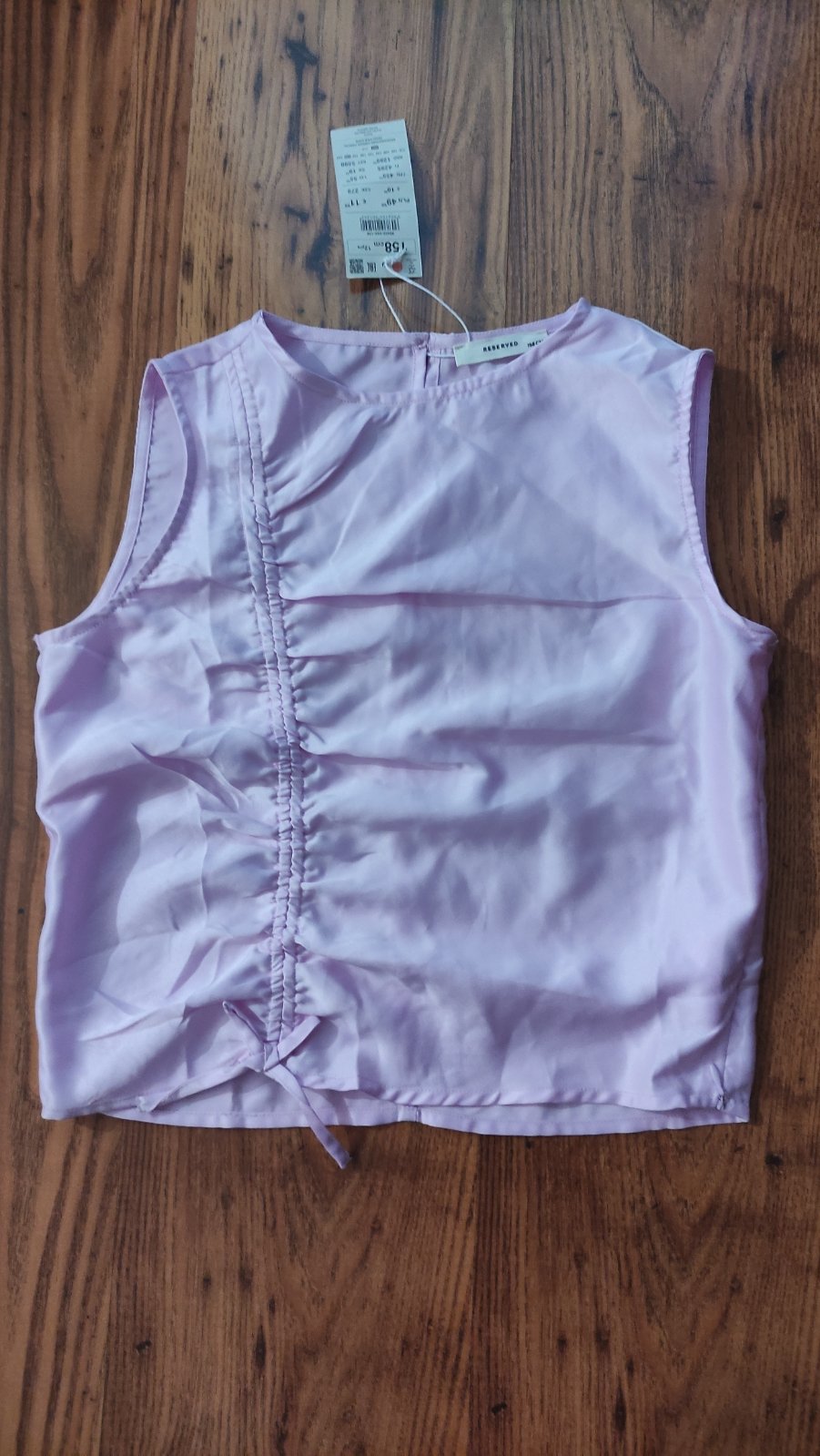 Bez poškodení a fľakov, Lila farba, na boku zips, aj pri krku gombík, dĺžka 46cm, šírka v podpazuší 43cm, taký lesklý satenovy materiál.