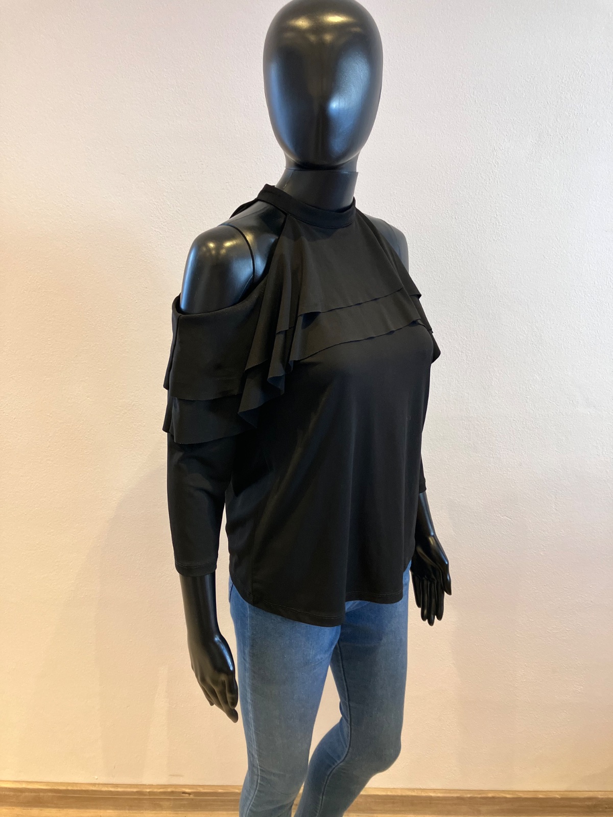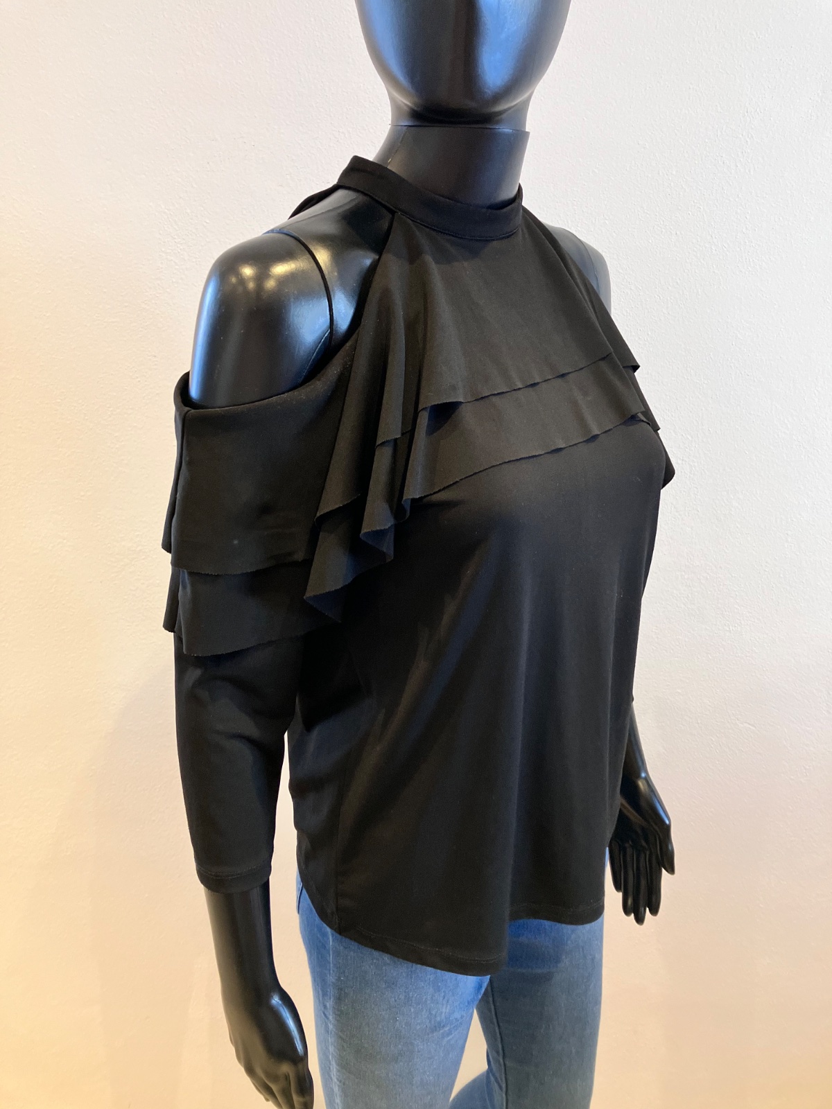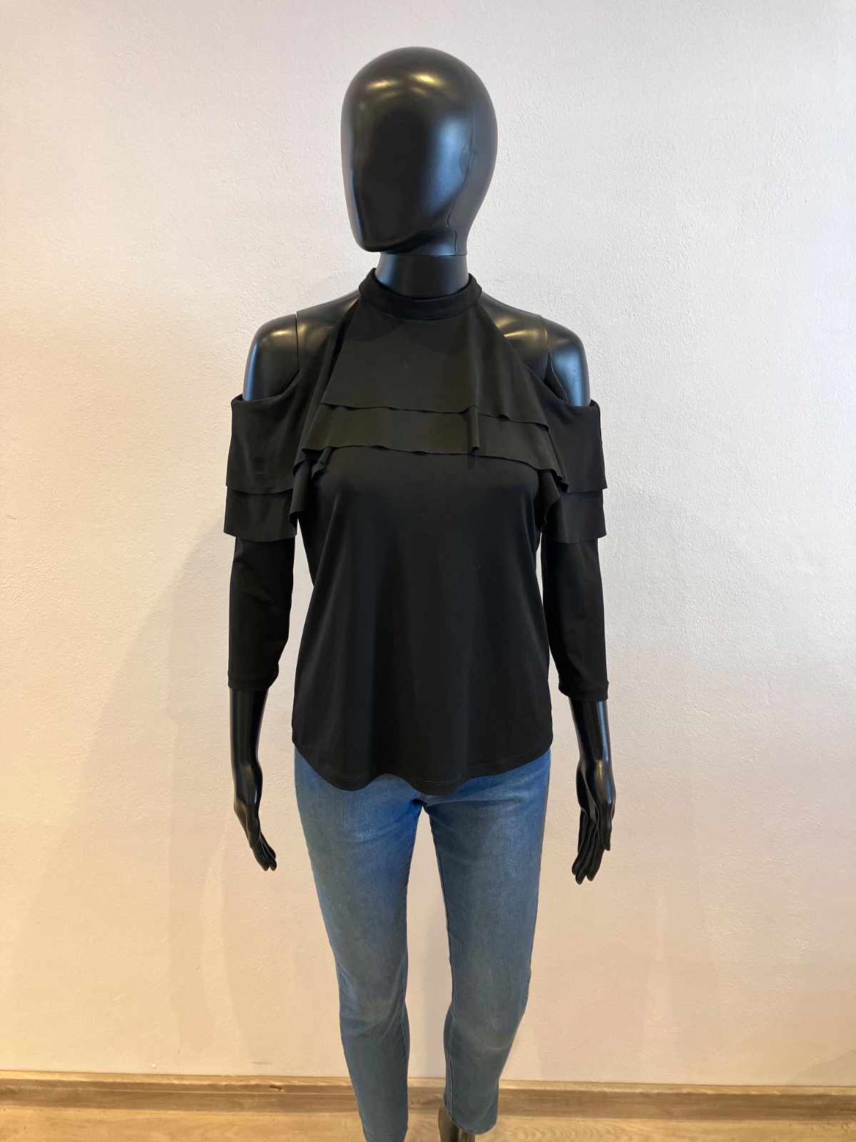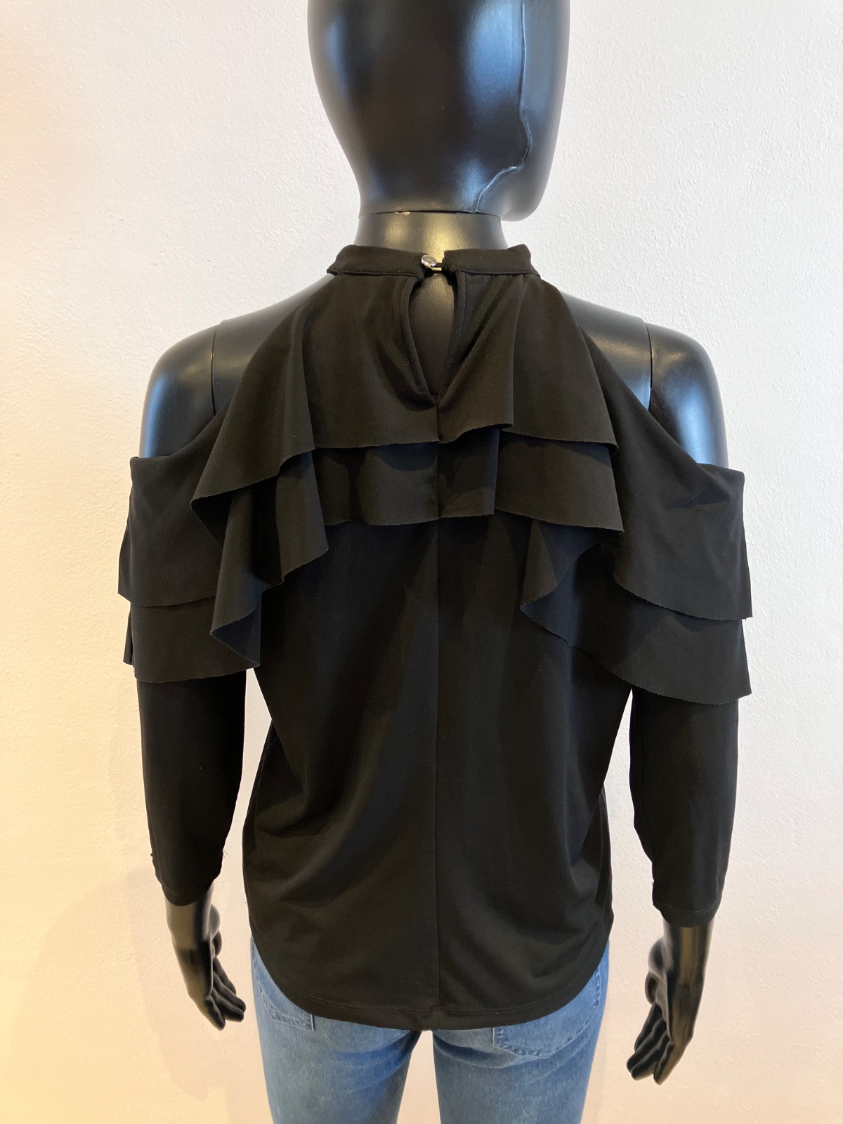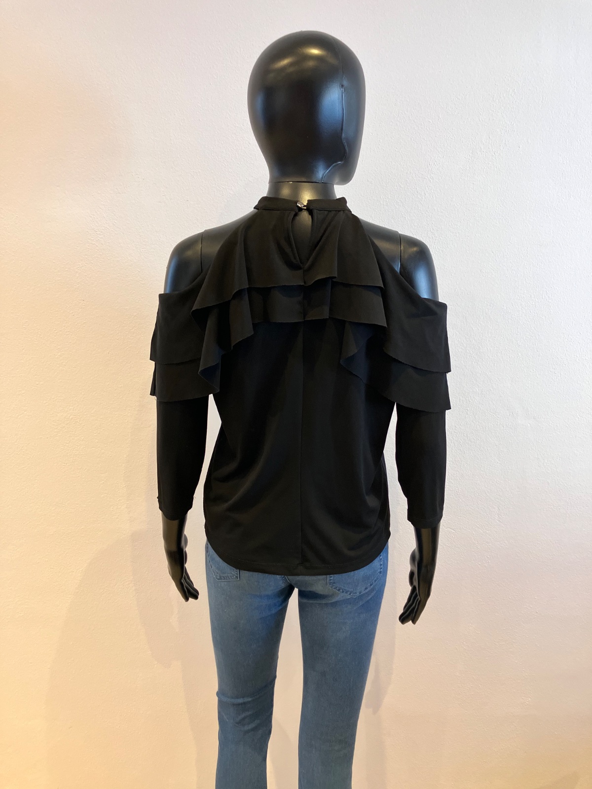 Dámska blúzka s volánom, trojštvrťový rukáv, elastická, čierna.