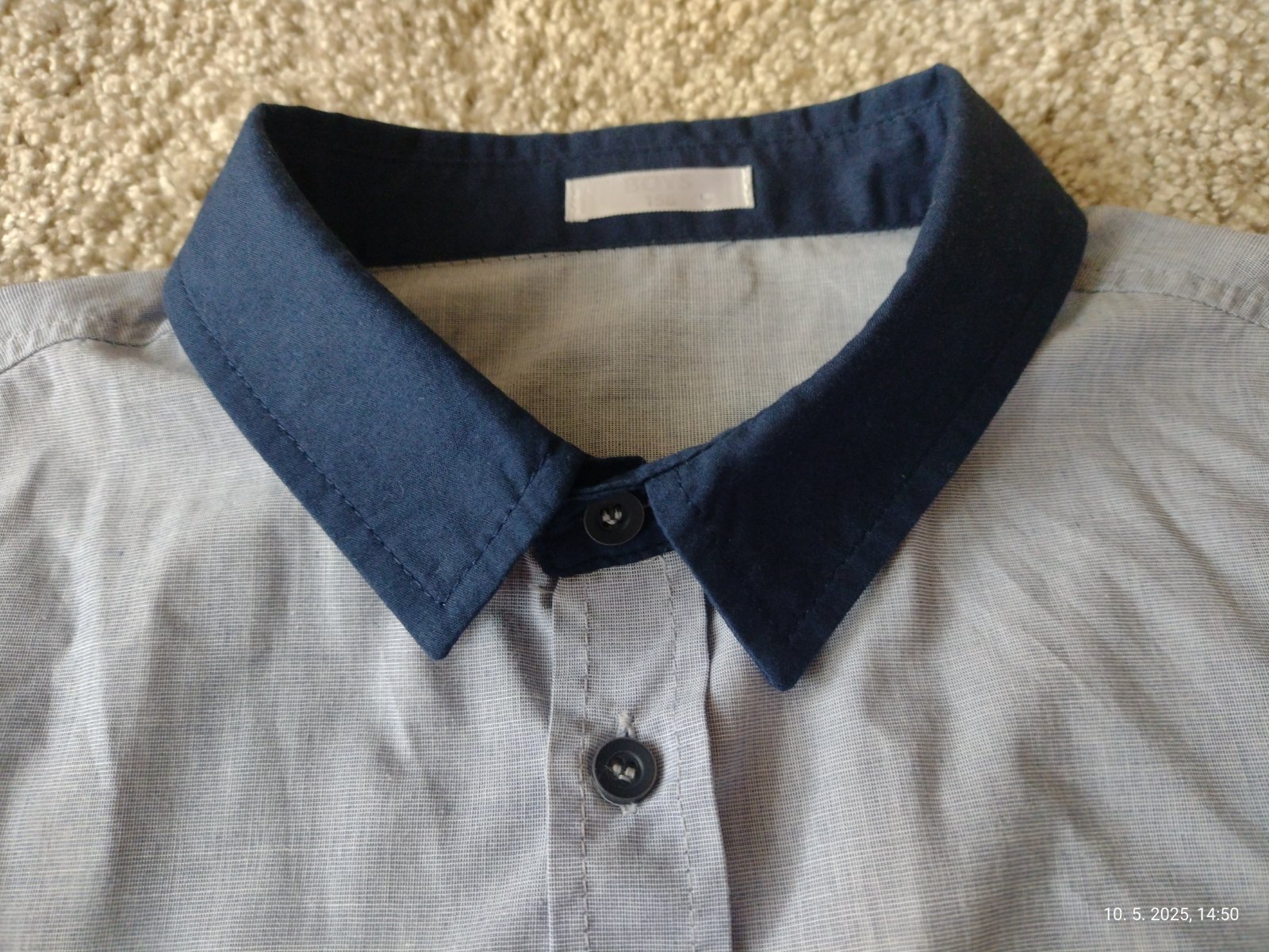 60% bavlna, 40% polyester. Golier tmavomodrý.