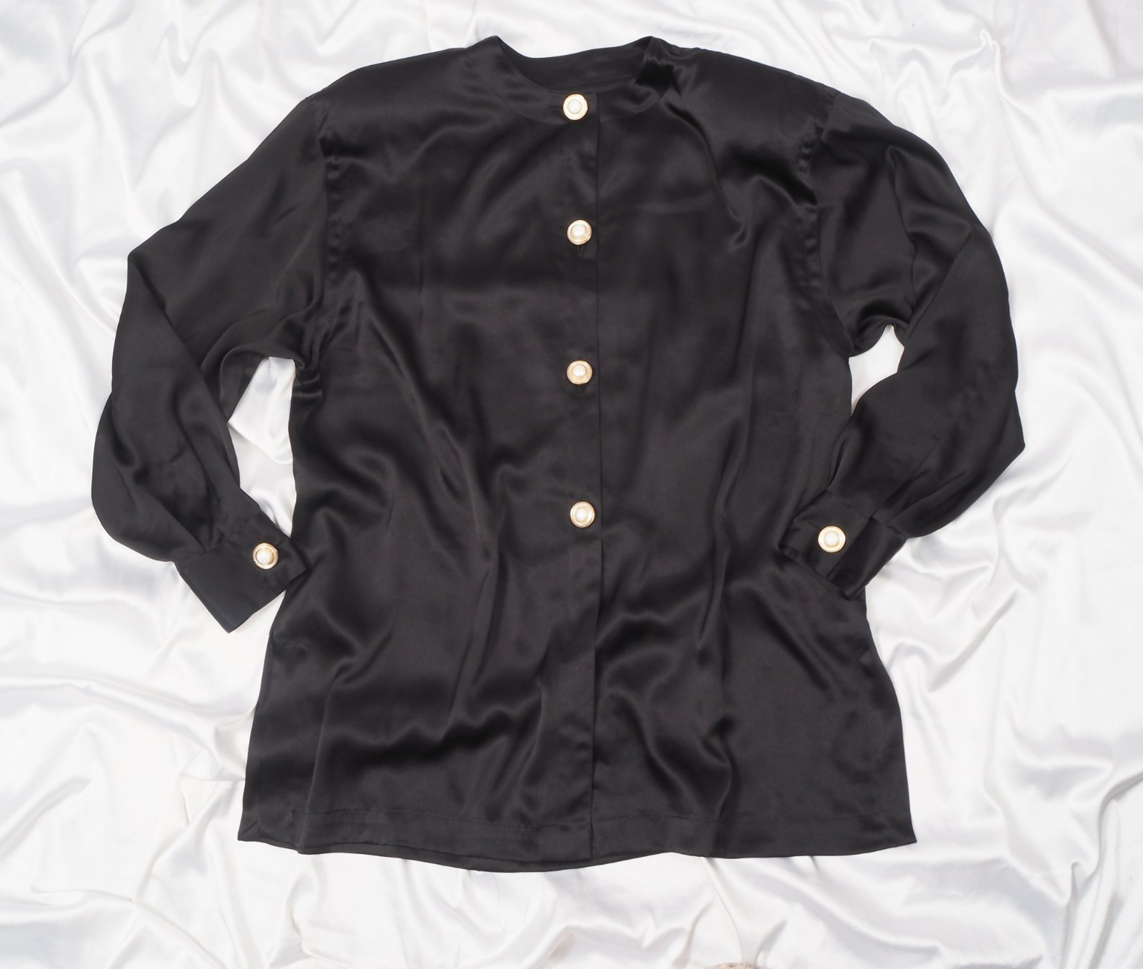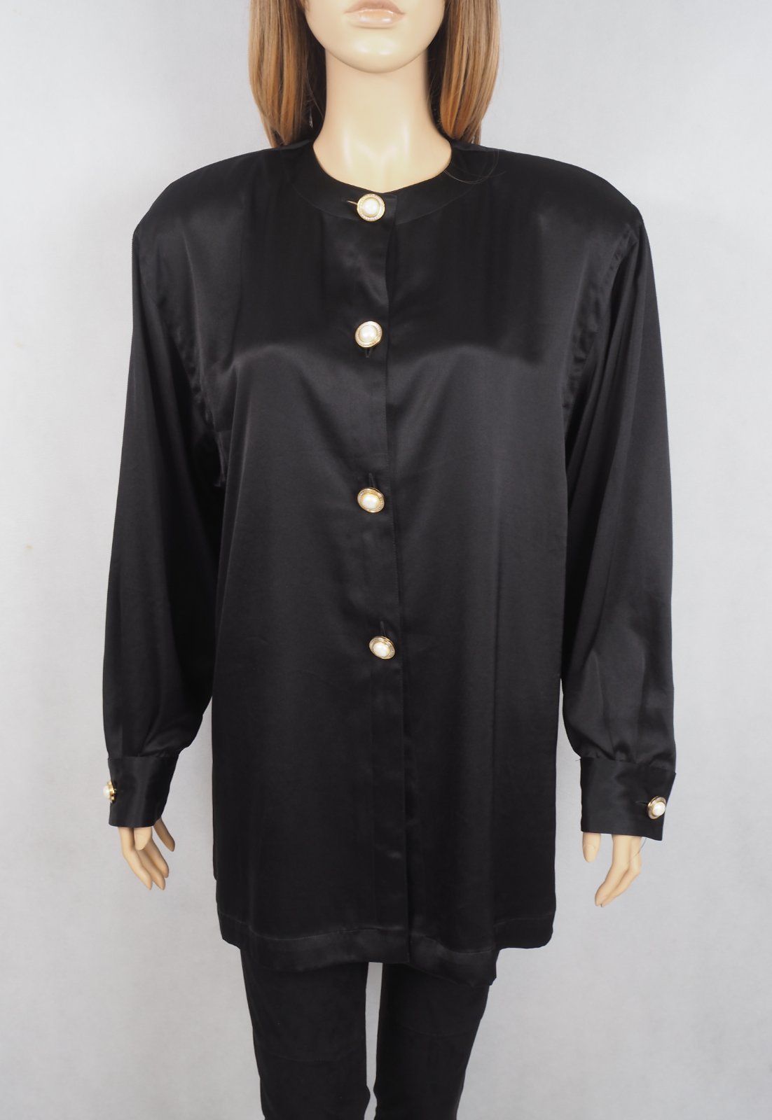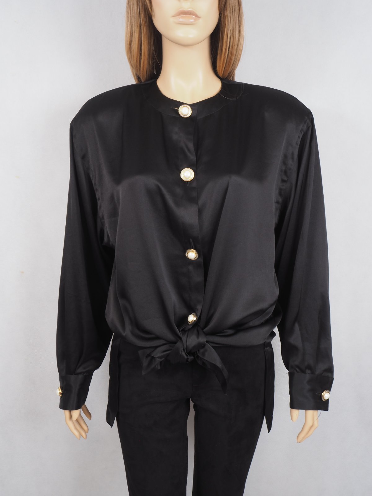 Kvalitná čierna saténová blúzka, zapínanie na ozdobné gombíky, vintage štýl s vypchávkami na ramenách, super stav.