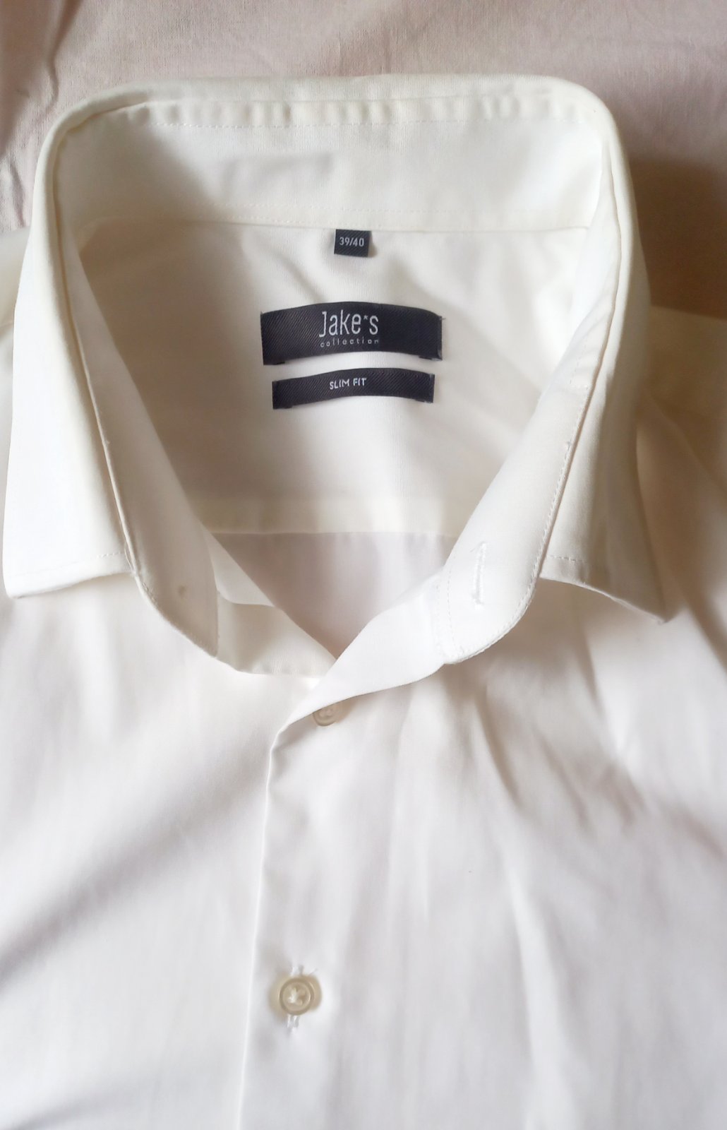 Pekná biela košeľa, no okolo goliera zvnútra trebalo by vyčistiť špeciálnym prostriedkom na košele. Inak je veľmi pekná. Košeĺa je malá, preto posúvam ďalej. ZN: JAKES. veľkosť 38/40. SLIM FIT. Spodná časť strihaná do oblúka