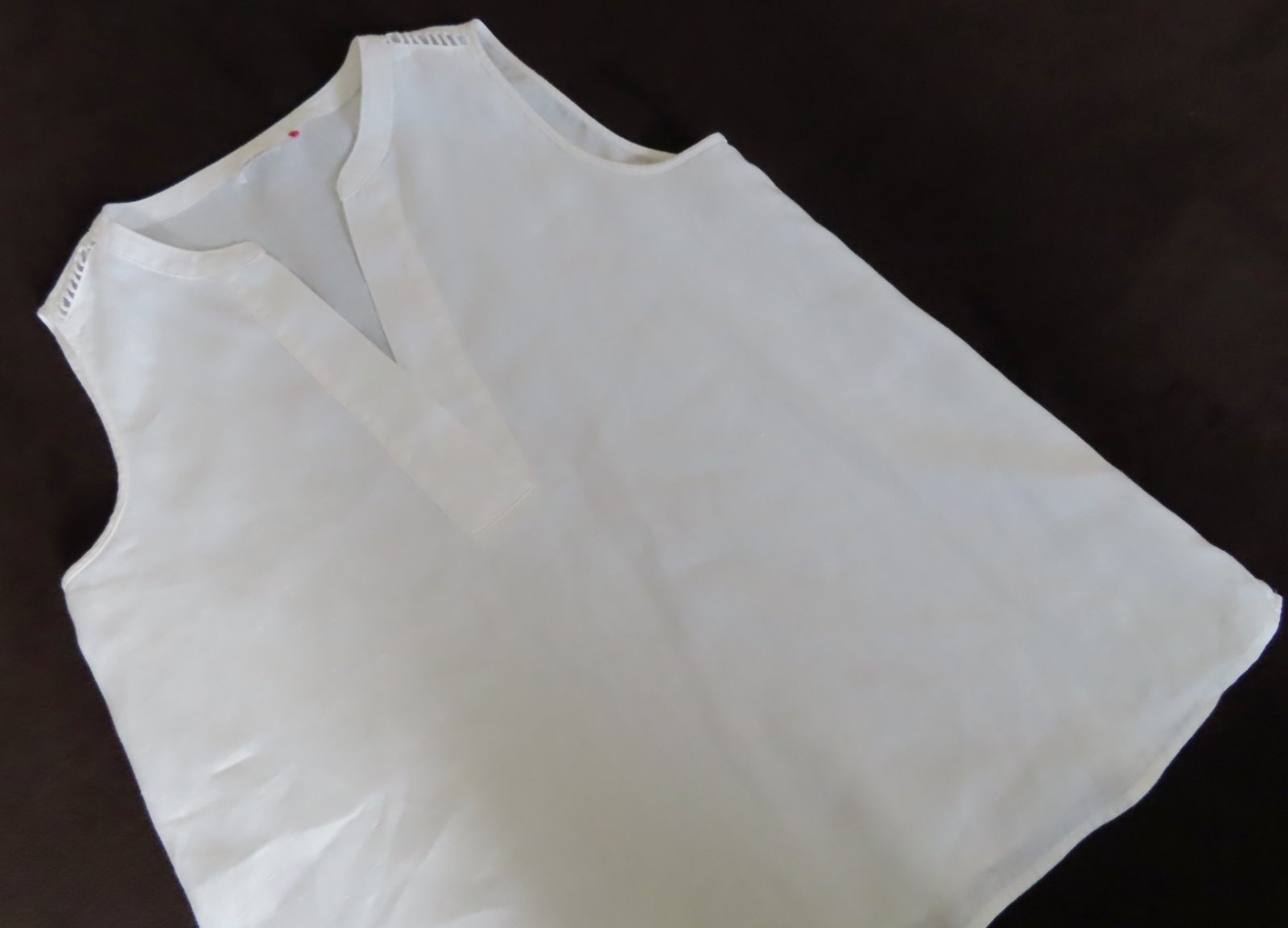 Blúzka má výstrih tvaru V, hore pri pleciach jemnučkú madeirovú výšivku.