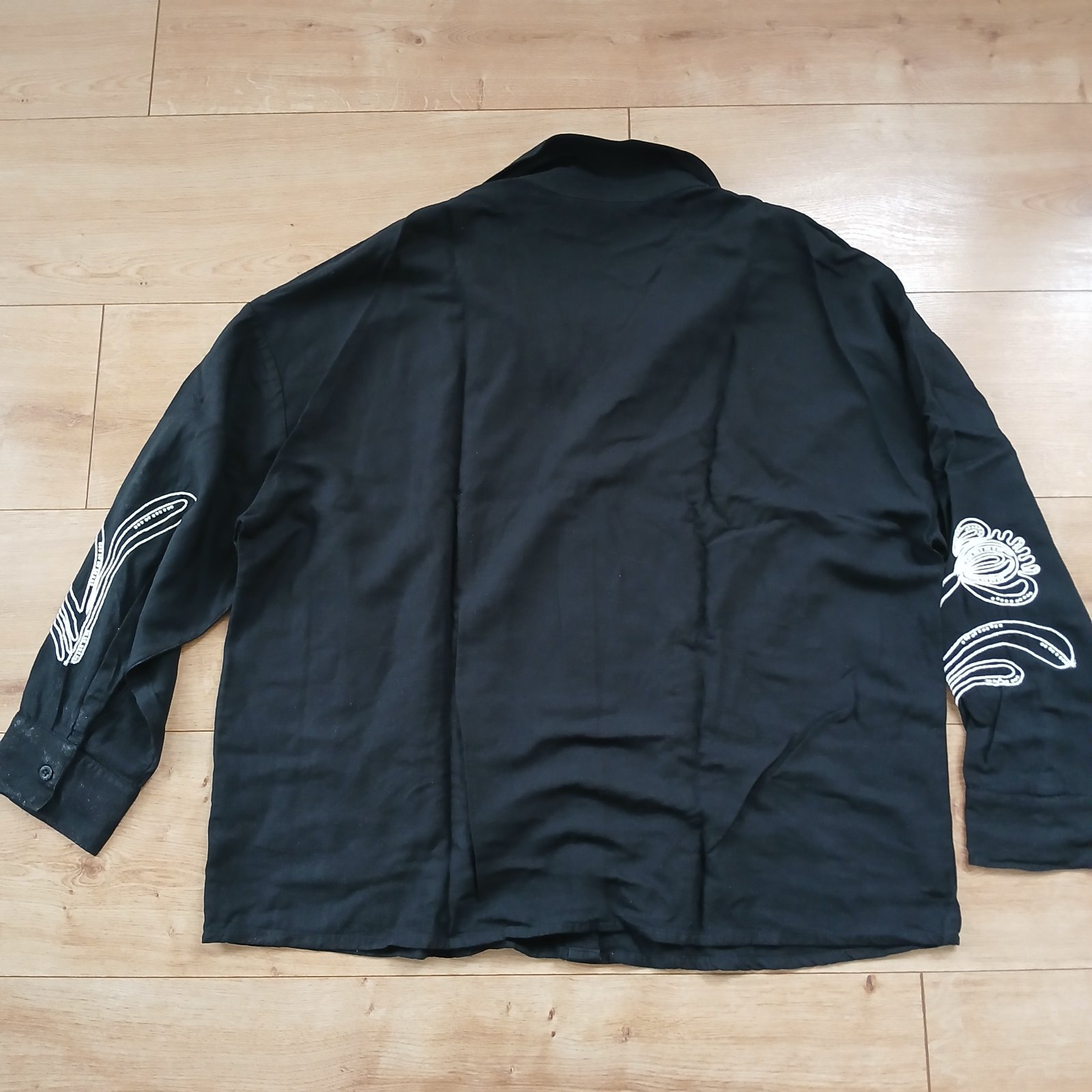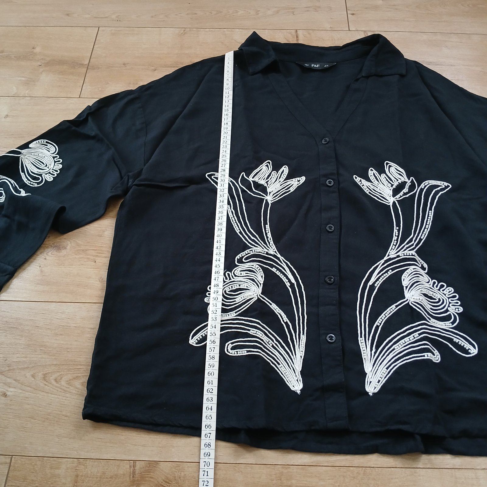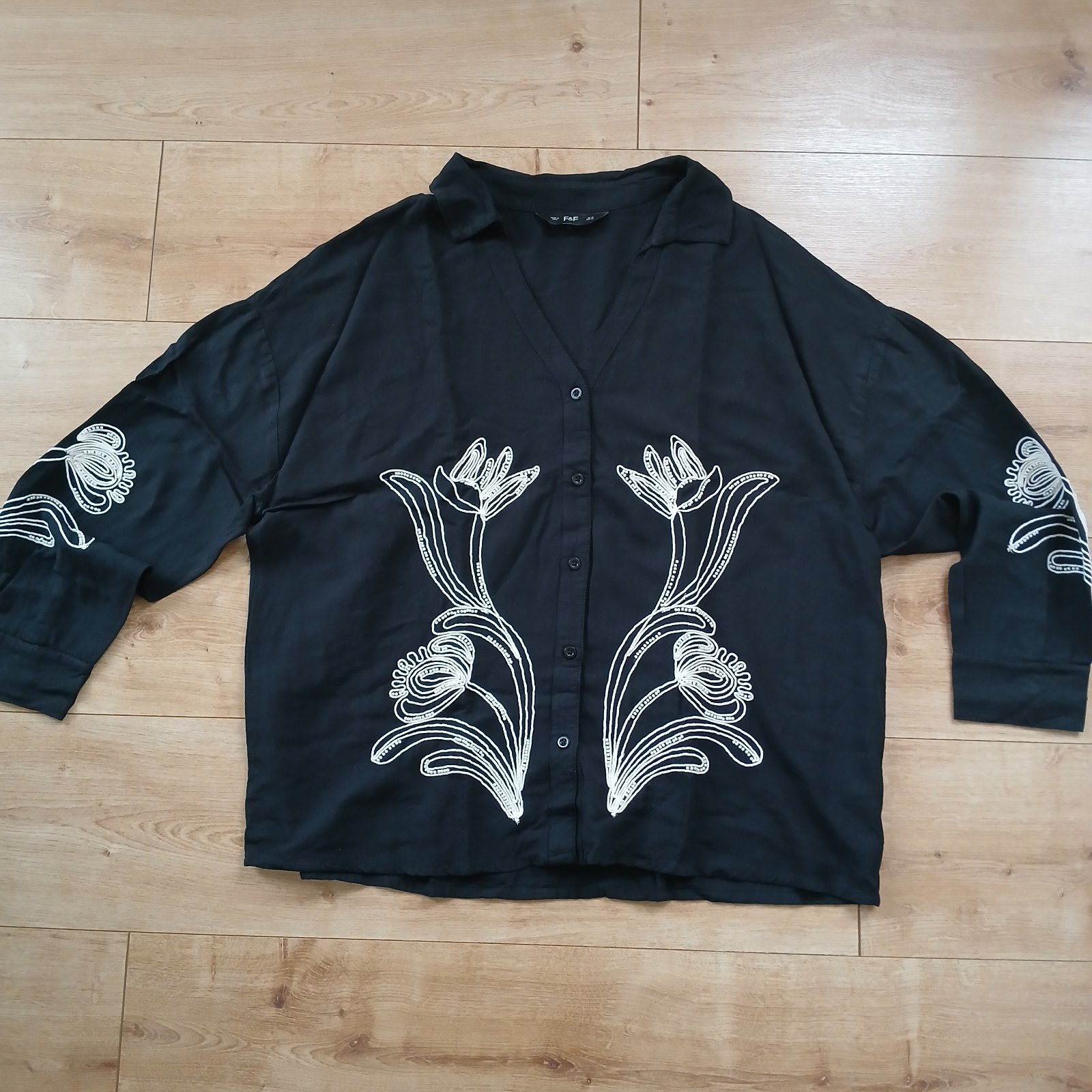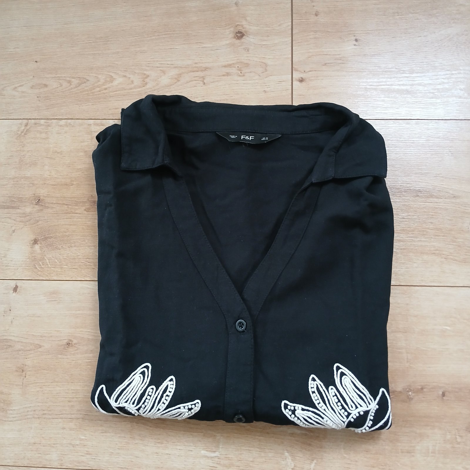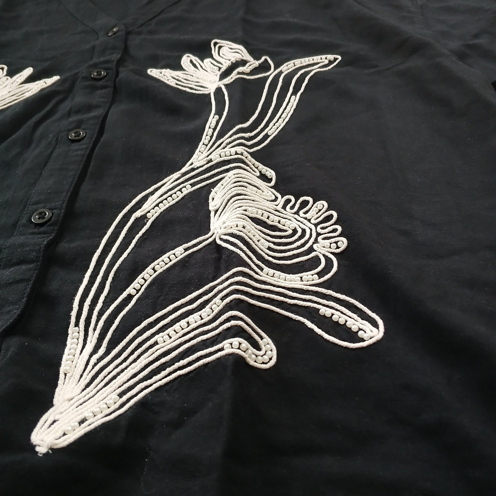 Ležérne čierna blúzka s bielymi vyšívanými kvetmi