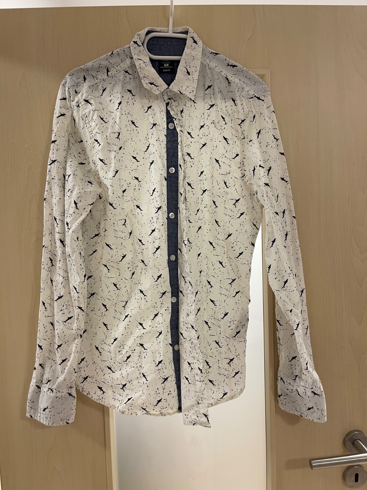 Košela slim fit s drobným modro čiernym vzorom, vo veľmi dobrom stave, bez poškodení.
