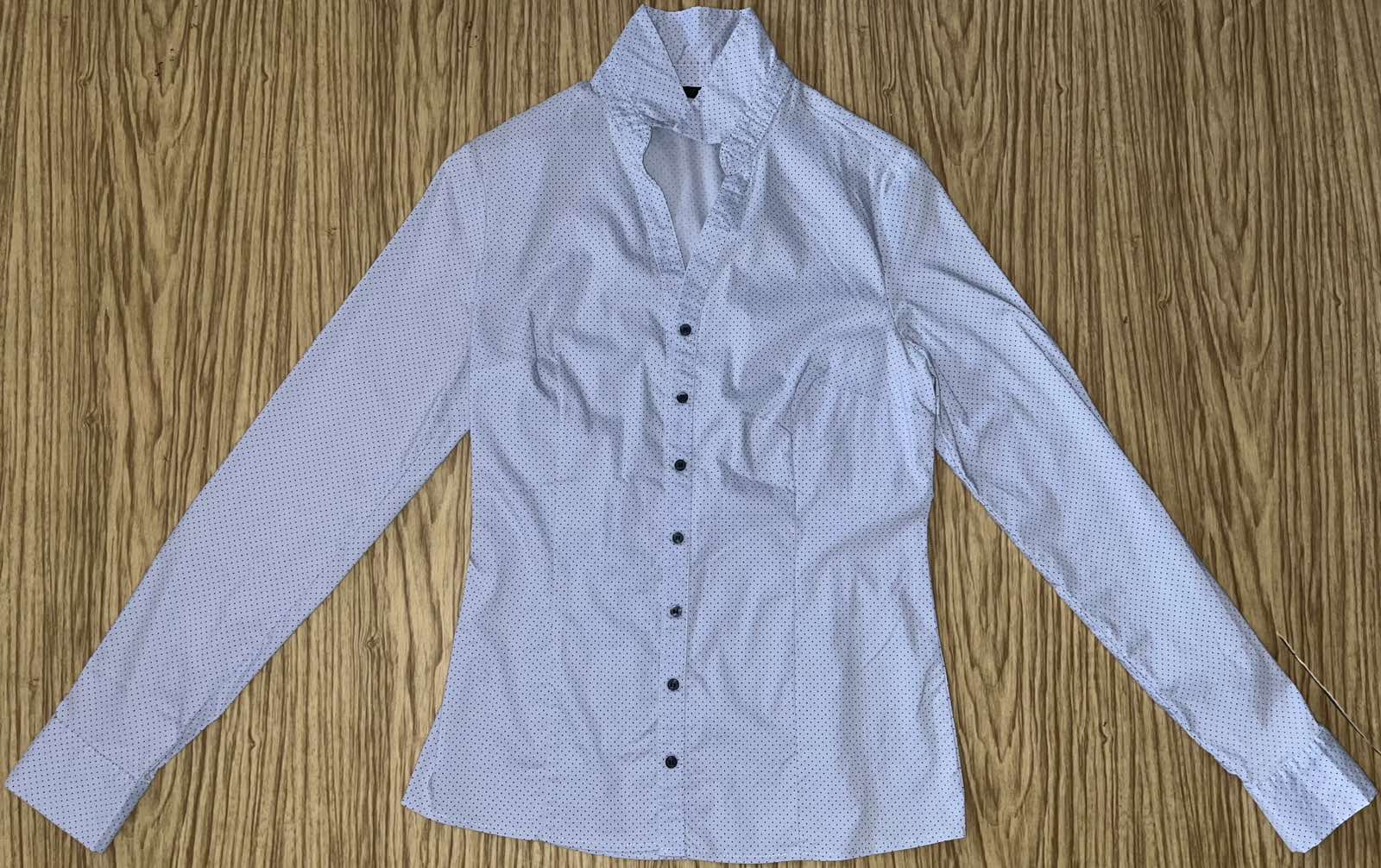 Darujem bledomodrú dámsku blúzku s jemným vzorom veľ. S, veľmi prispôsobivý materiál s elastanom. Výborný stav, bez známok nosenia.