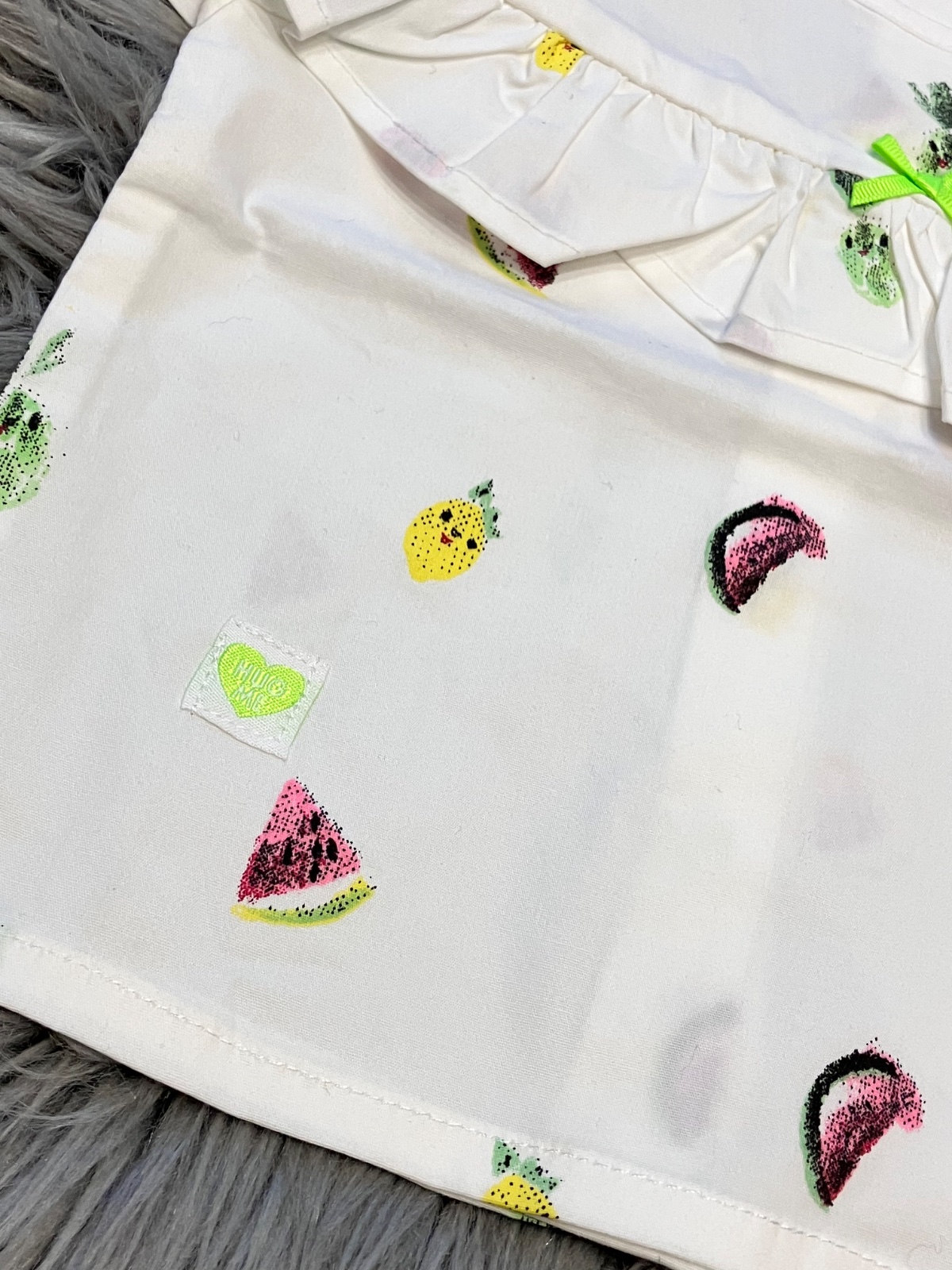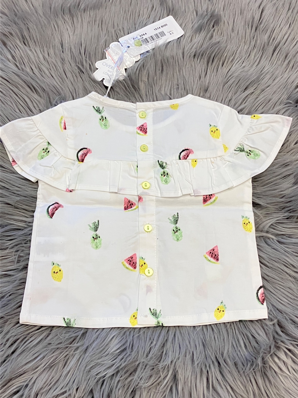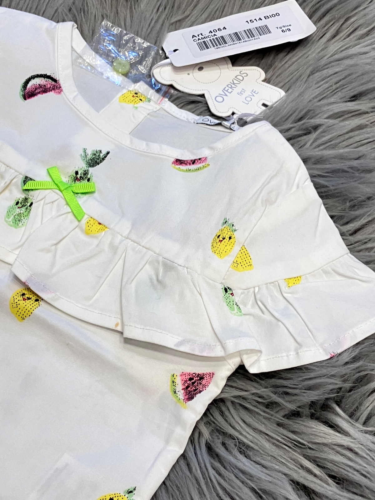 Dievčenská tenká košeľa s krátkym rukávom a volánom značky Overkids, vzorovaná, jemne elastická, zapínanie vzadu na gombíky. Pre 6-9 mes. Materiál: 97%bavlna,3%elastan.