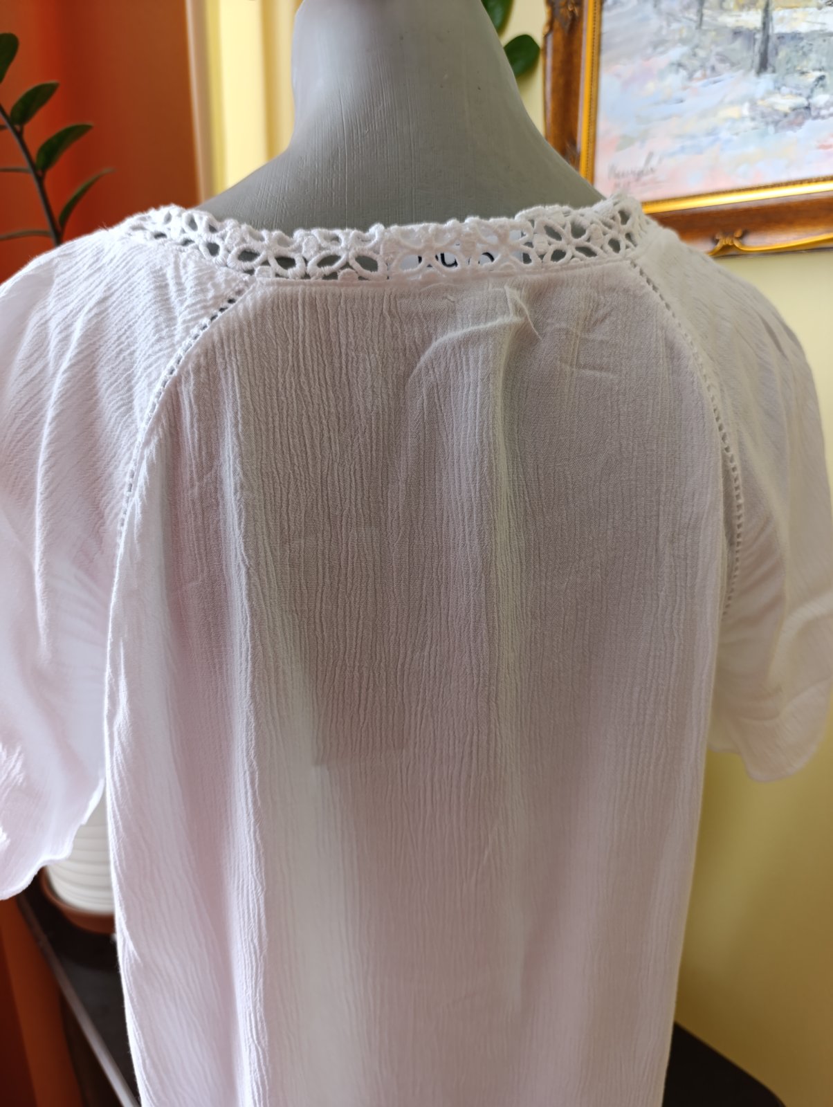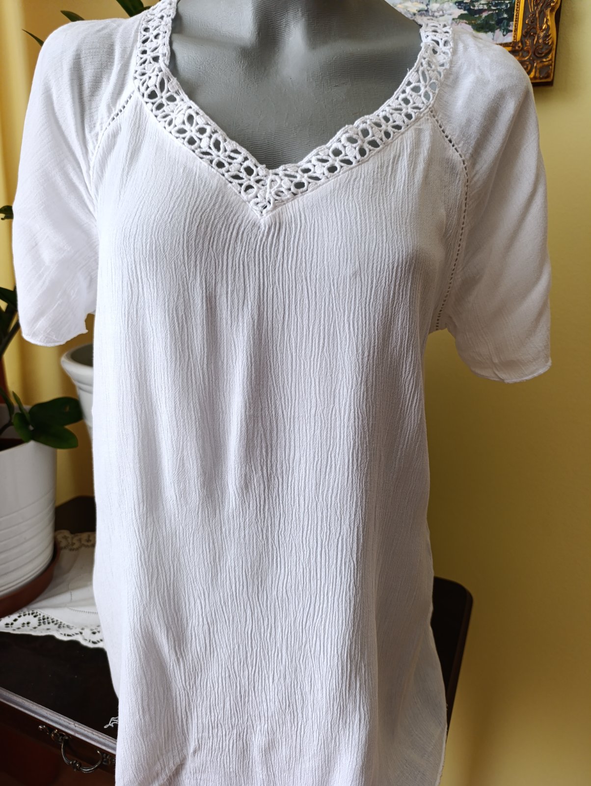 Nosené minimálne,avšak na spodnom okraji sú poškodenia - preto znižujem cenu ,ináč je bielunka ako sneh a príjemný materiál na leto, prsia 56 x2, dĺžka 64 cm