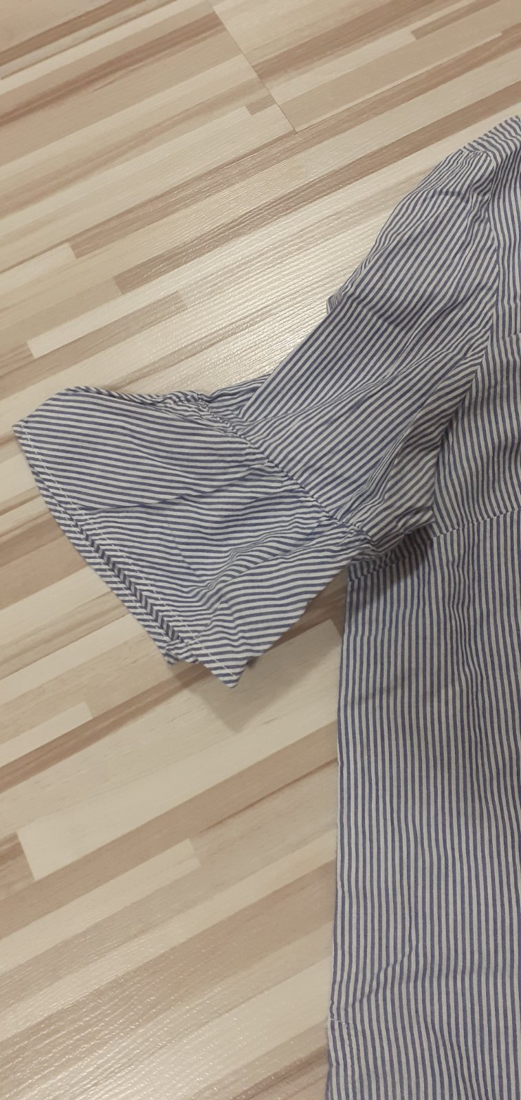 Modra bluzka s V vystrihom a volanovymi rukavmi stiahnute gumickou, v pase guma Rozmery: pod pazuchami 47 cm, dlzka 54 cm
