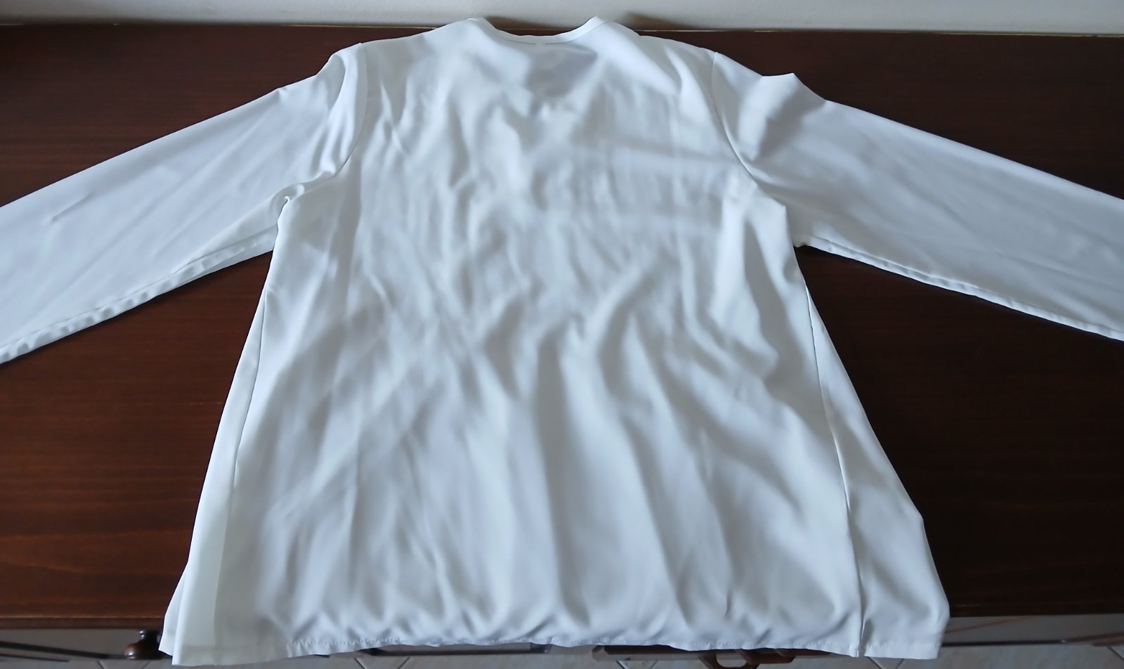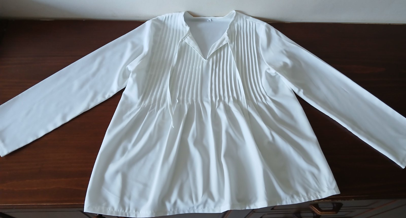 Predám bielu blúzku podobnú tunike veľmi málo nosenú a vo výbornom stave. Veľkosť S, zloženie : 35% bavlna a 65% polyester. Blúzka je z príjemného materiálu, vpredu nariasená, s výstrihom do V. Dĺžka rukáva meraná od ramena je 58 cm, a celková dĺžka blúzky je 64 cm.