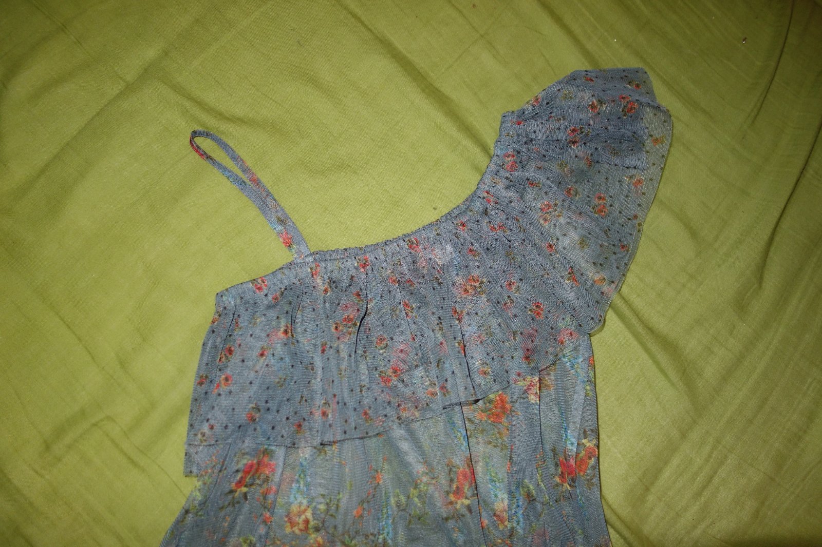 Krasna tylova bluzocka vo vybornom stave. Je priesvitna, treba pod nu este tricko. Je takej ocelovo-modrej farby.