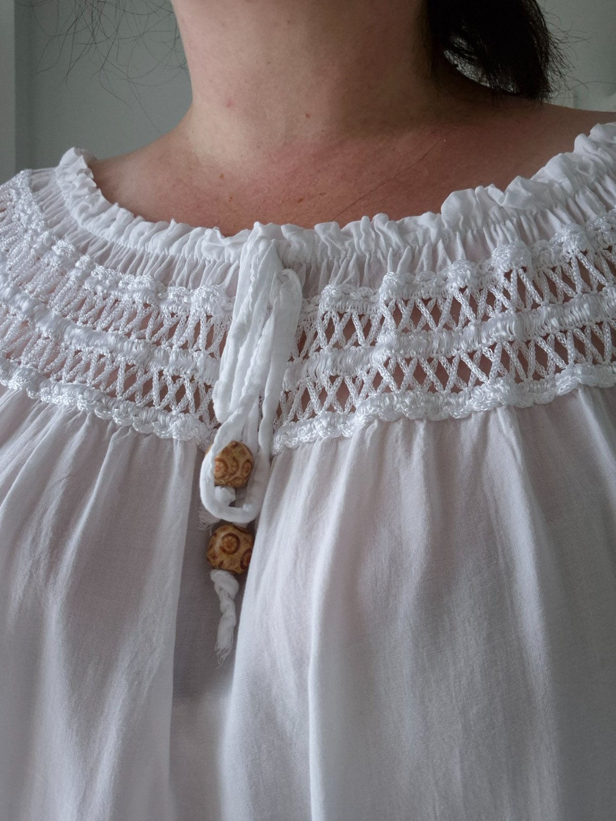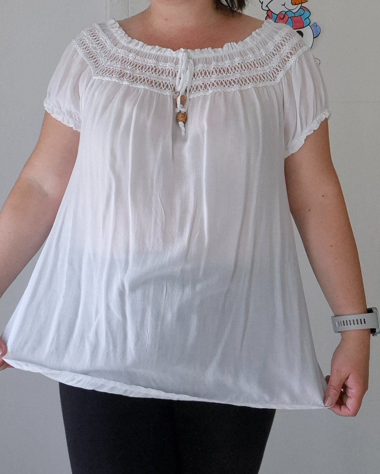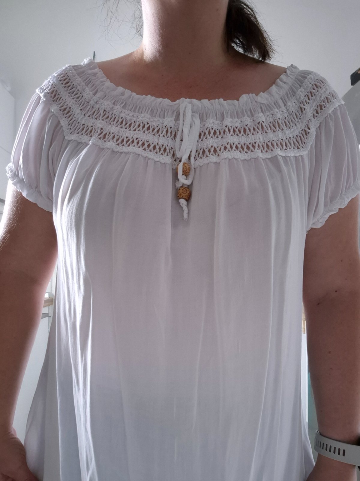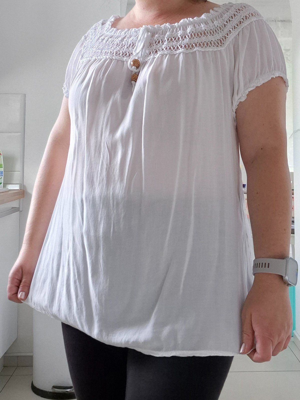 Biela blúzka/tunika, nová, nevhodný dar, moc priesvitná na mňa. Vpredu zaujímavá dekorácia. Neuvádza sa velkost, tipujem XL. Lahucky material.