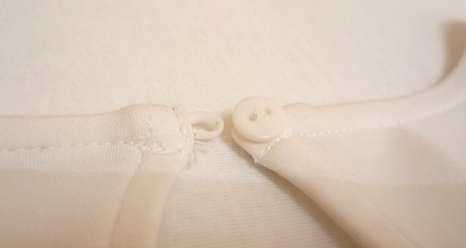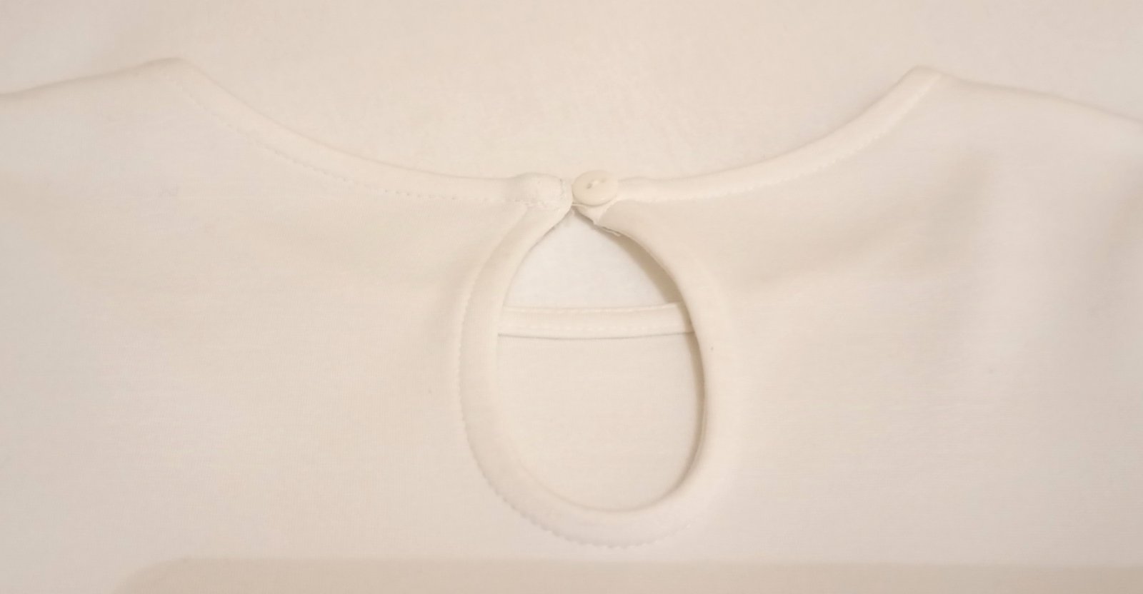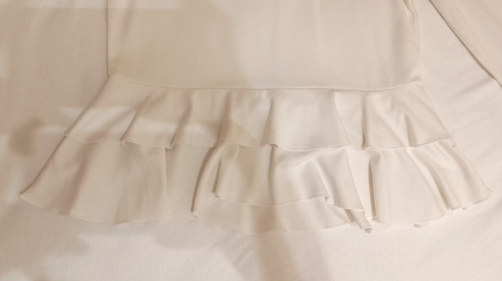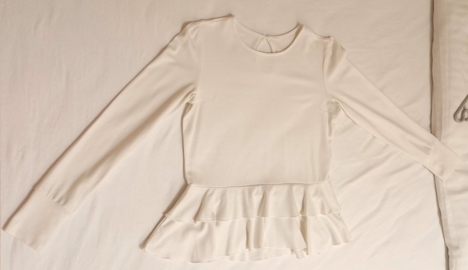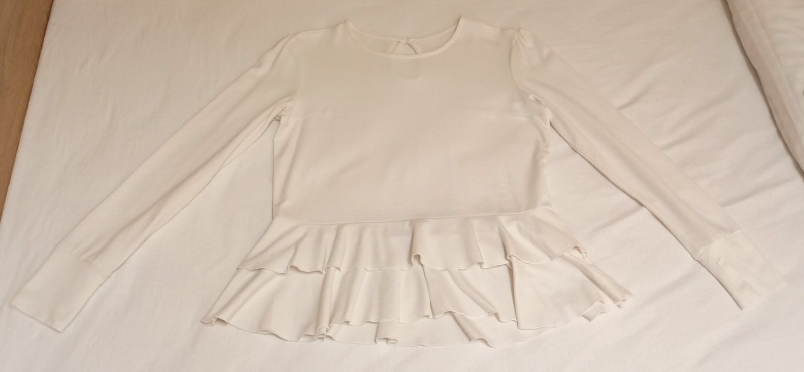 Trošku hrubšia blúzka s dlhým rukávom a peplum elementom na spodku vo farbe medzi bielou a veľmi svetlou krémovou. Zapína sa na jeden gombík zozadu na krku.