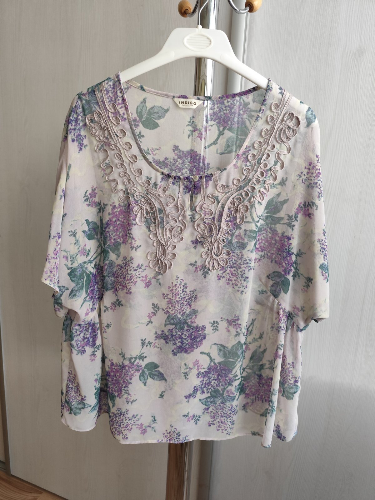Tenká, ,ľahučká, mierne priesvitná blúzka, voľný strih. Cez prsia 2 x 58 cm, dĺžka 69 cm. Veľmi dobrý stav.