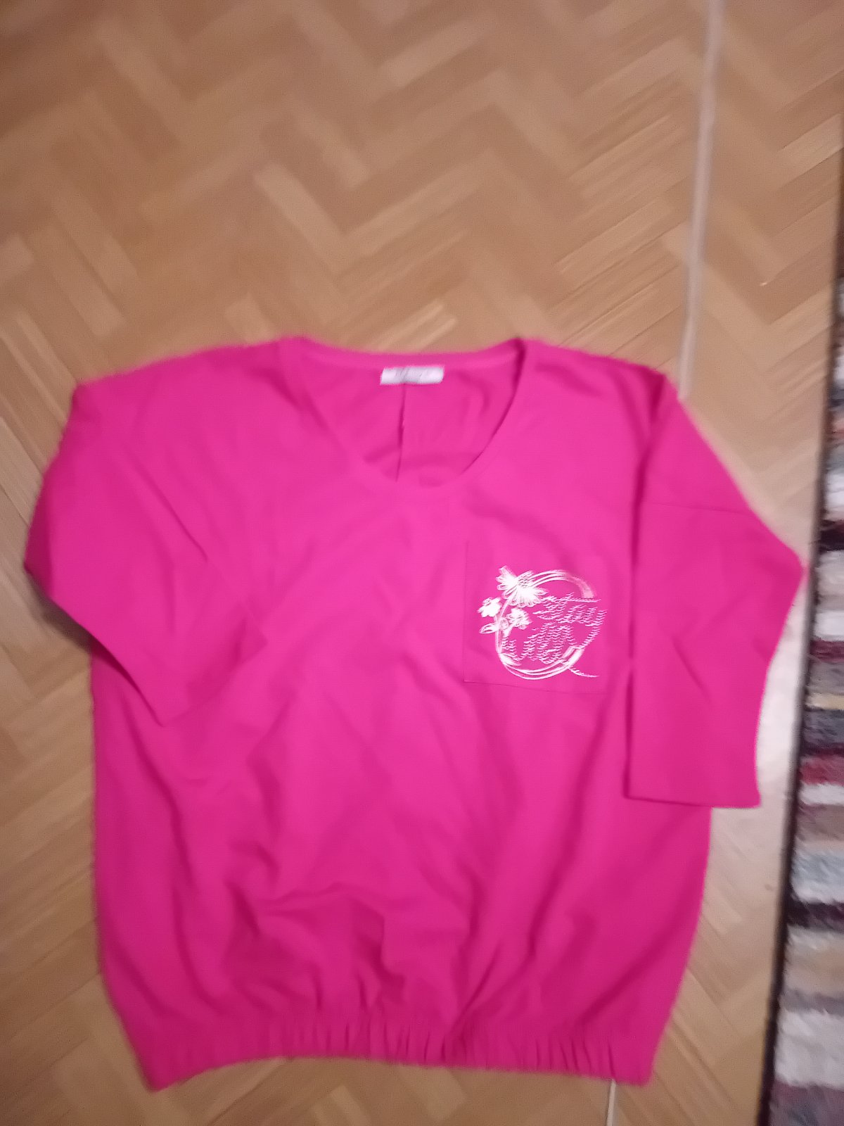 Blúzka je veľkí pekná vpredu malé vrecko s aplikaciou 3/4 rukáv dolu ukončené do gumicky celková dĺžka 60 cm priemer cez prsia 57 cm neposkodena skoro nosiť môže pani aj slecna blúzka ma na vrecku pozlatenu aplikaciu