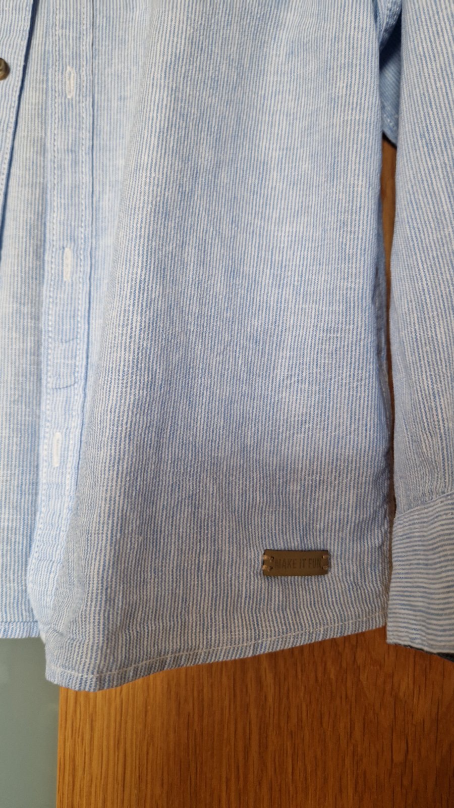 Nádherná kvalitná košeľa, nosená iba mojim synom. Top stav. Všetky gombíky sú funkčné. Rukáviky sa dajú vyhrnúť, z vnútornej strany sú kontrasné manžetky vo farbe jeans.