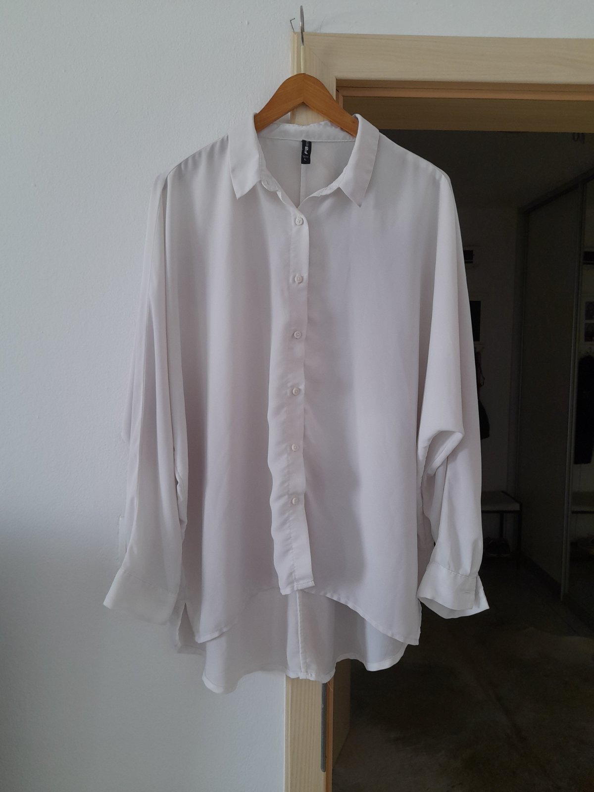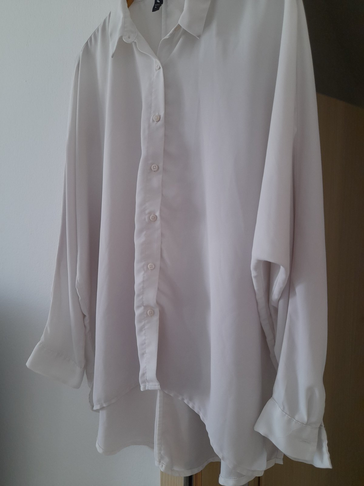 Veľ: odhadom XL, šitá na mieru, rozmery viď. foto Farba: biely základ skoro do sv. šedá, s tm. šedými prúžkami. Stav: top stav, priesvitná, kombinovateľná, málo nosená, strih voľný. gombíky perleť...