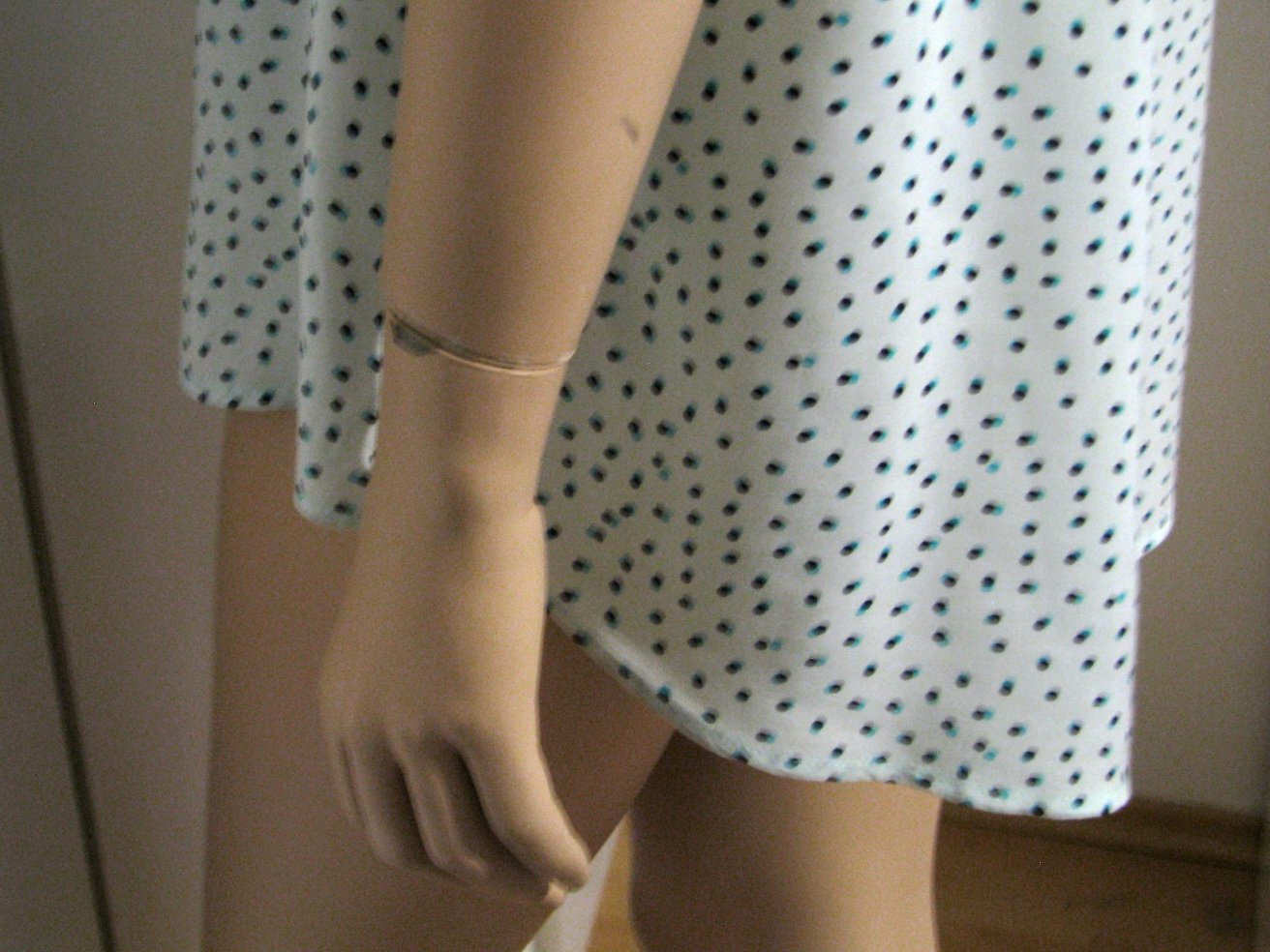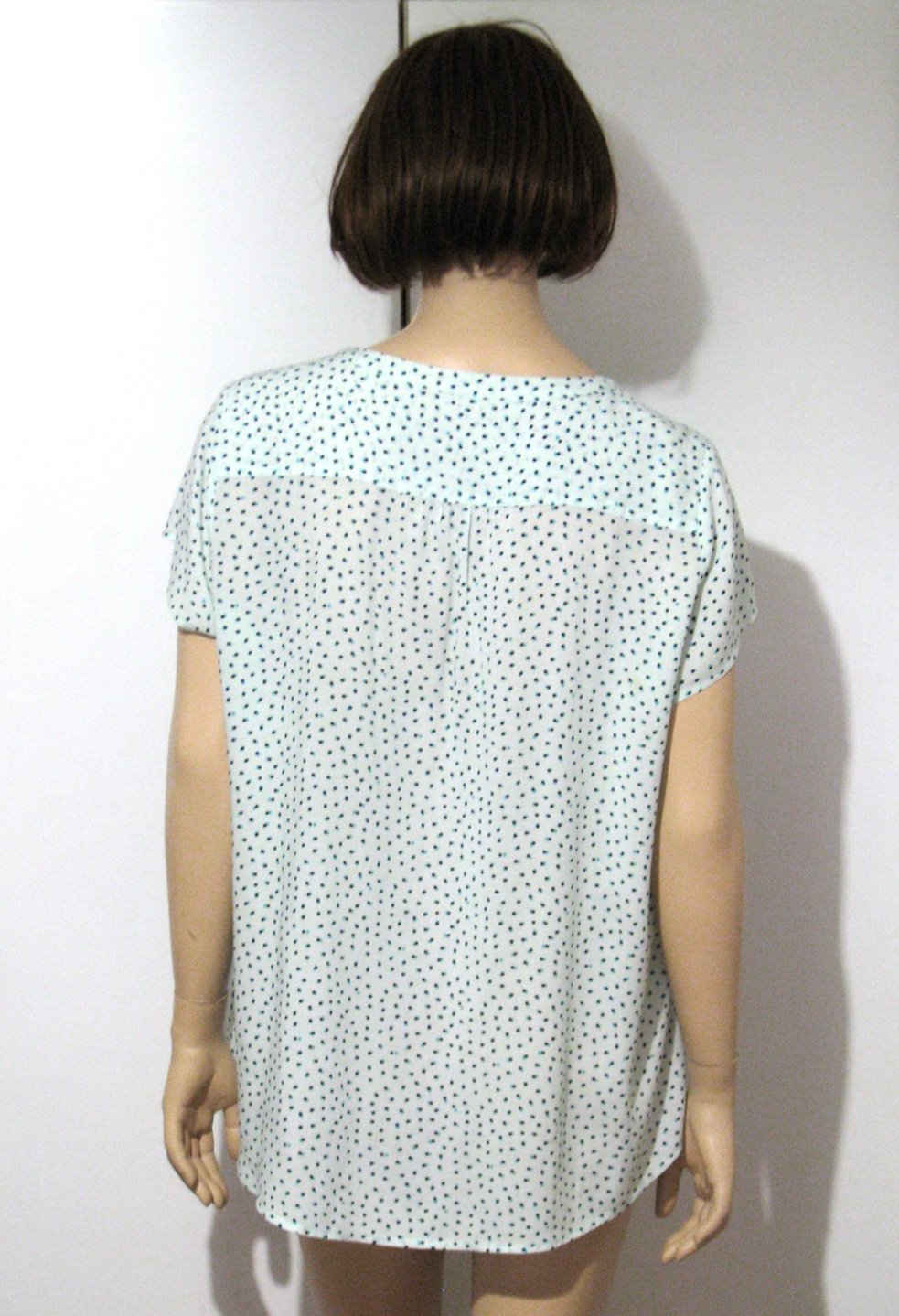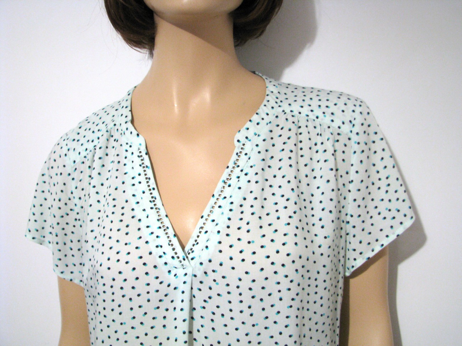 Bodkovaná blúzka úplne svetlej mentolovej farby, s tmavomodro - tyrkysovými bodkami. Výborne zachovalá, bez poškodení. Štítok s veľkosťou a materiálom odstrihnutý, no je to asi XL, resp. dosť univerzálna veľkosť a materiál je pravdepodobne viskóza. V prípade záujmu premeriam.