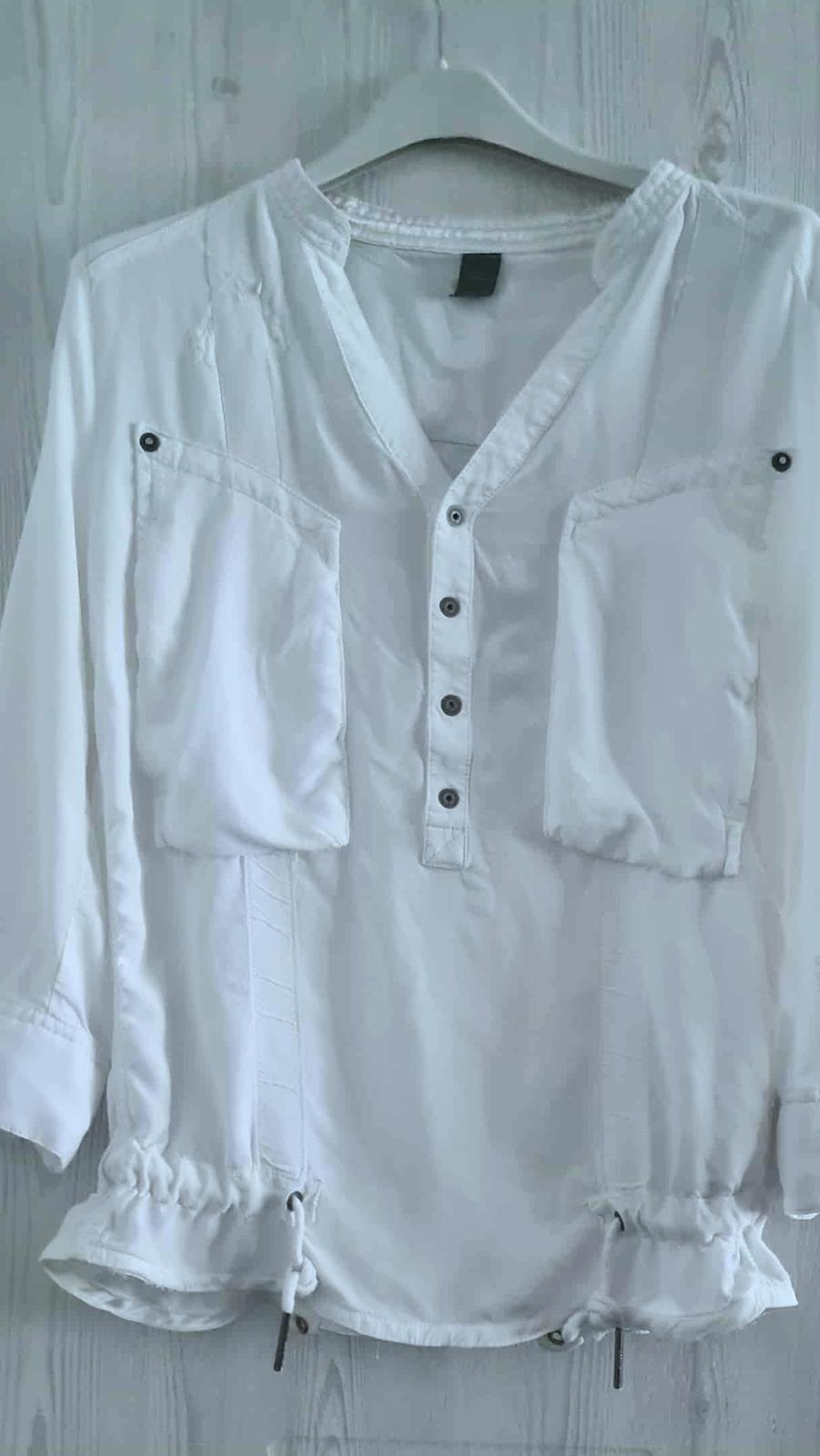 Biela široká viskózová blúzka, 3/4 široký rukáv do tvaru "A", veľkosť "M"; vpredu je biela výšivka, límec vpredu okolo krku má dekor čipky s kamienkami; vzdušná. Po opratí nie je potrebné žehliť. N...